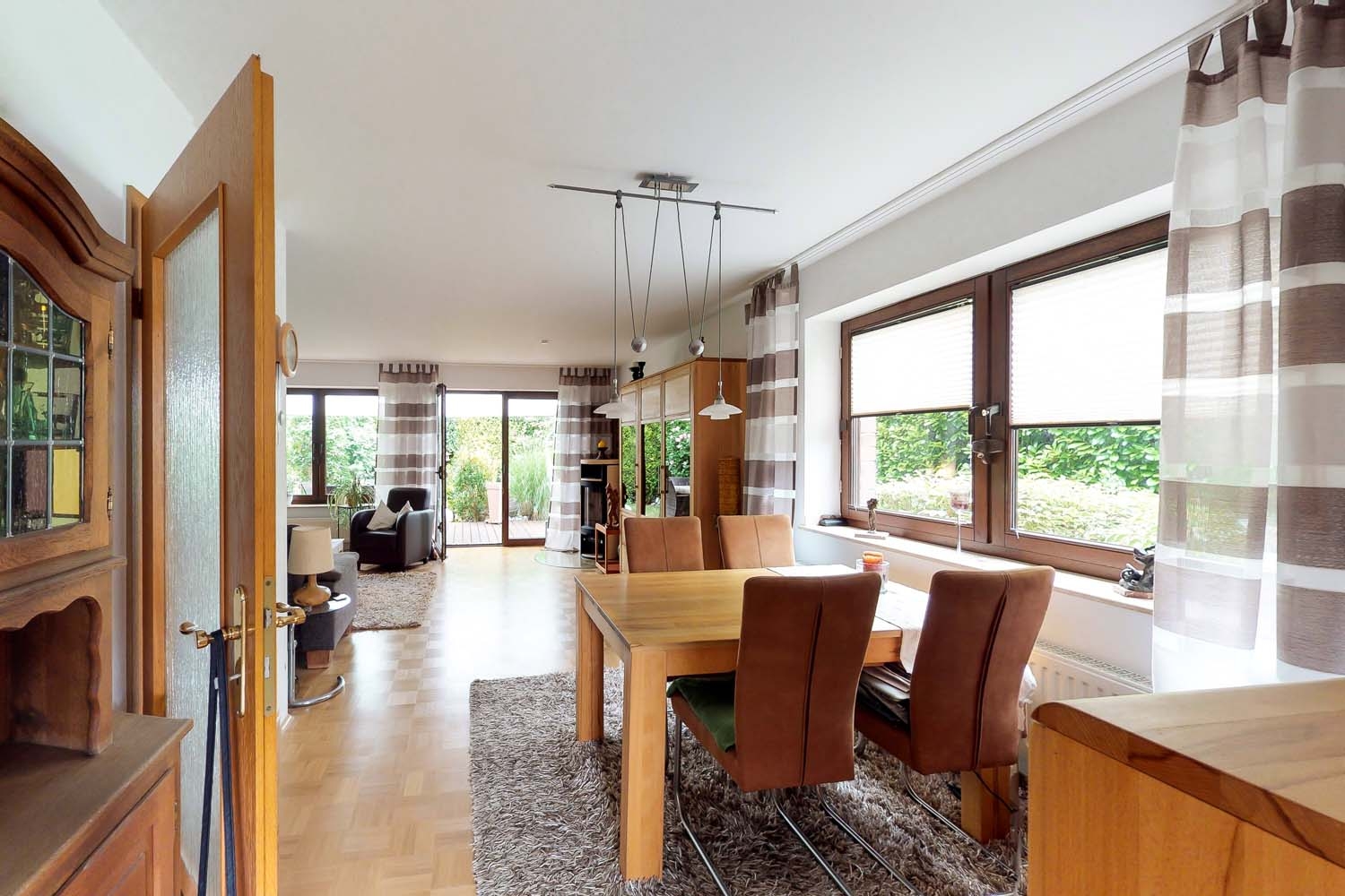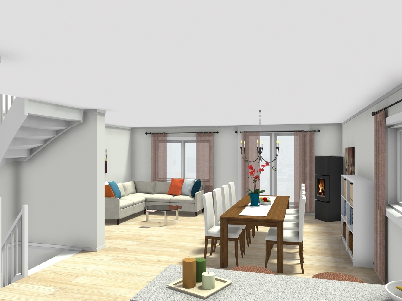 Das Familienzentrum des Hauses bietet genug Platz für einen großen Esstisch, an dem alle zusammen den Tag ausklingen lassen können und sich gegenseitig die spannendsten Geschichten aus Arbeit und Schule erzählen, während eine große Schüssel Ihres Lieblingsessens herumgereicht wird. Oder eben eine Runde Relaxen auf der Eckcouch vor dem Kaminofen, zusammen beim Fernsehen oder allein mit einem Buch, wenn alle anderen in Ihren Zimmern verschwunden sind.