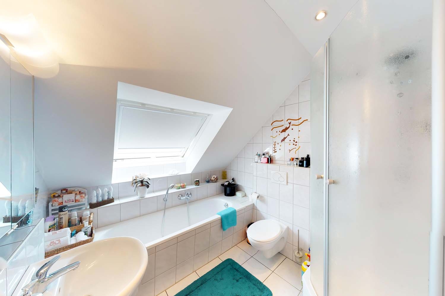 - Bad weiß gefliest, weiße Sanitärausstattung