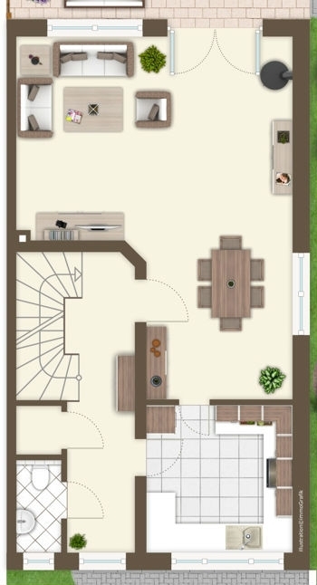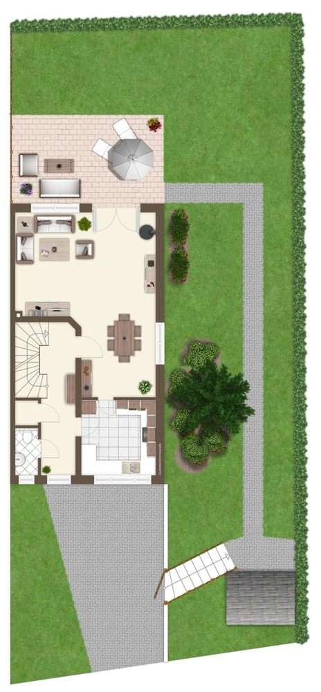 Das Wetter ist viel zu schön, um drinnen zu sein? Dann öffnen Sie die Glastüre und verlagern Sie Ihr Sonntagsfrühstück auf die überdachte Terrasse. Der Kaffee und die backfrischen, warmen Croissants schmecken bei leisem Vogelgezwitscher und einer milden Sommerbrise doch direkt doppelt so gut. Und niemand kann es Ihnen verübeln, wenn Sie nach dem Frühstück erst einmal die nackten Füße in das von der Sonne erwärmte Gras strecken, bevor Sie endgültig in den Tag starten. Denn an Arbeit denkt bei so einem pflegeleichten Garten nun wirklich niemand.