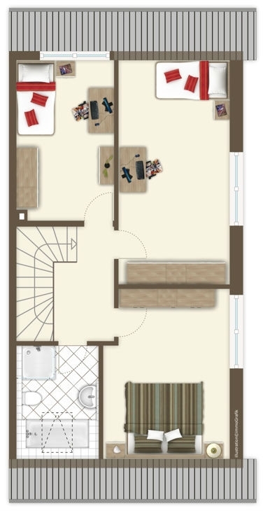 Im Obergeschoss warten drei Rückzugsorte auf jedes Familienmitglied. Hier kann jeder einmal die Türe schließen und ein wenig Zeit für sich genießen, wenn der Familienalltag einem einmal zu bunt wird.