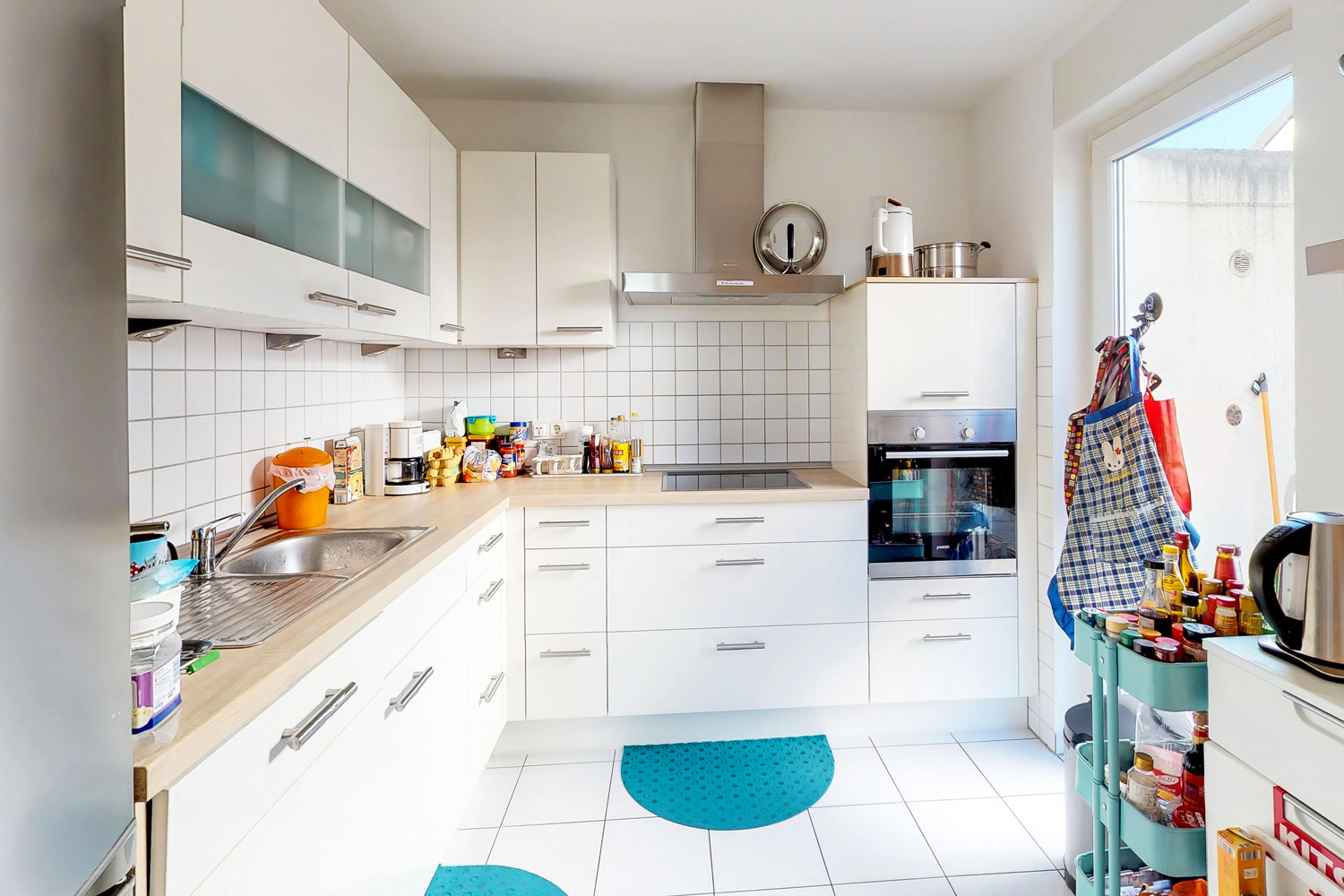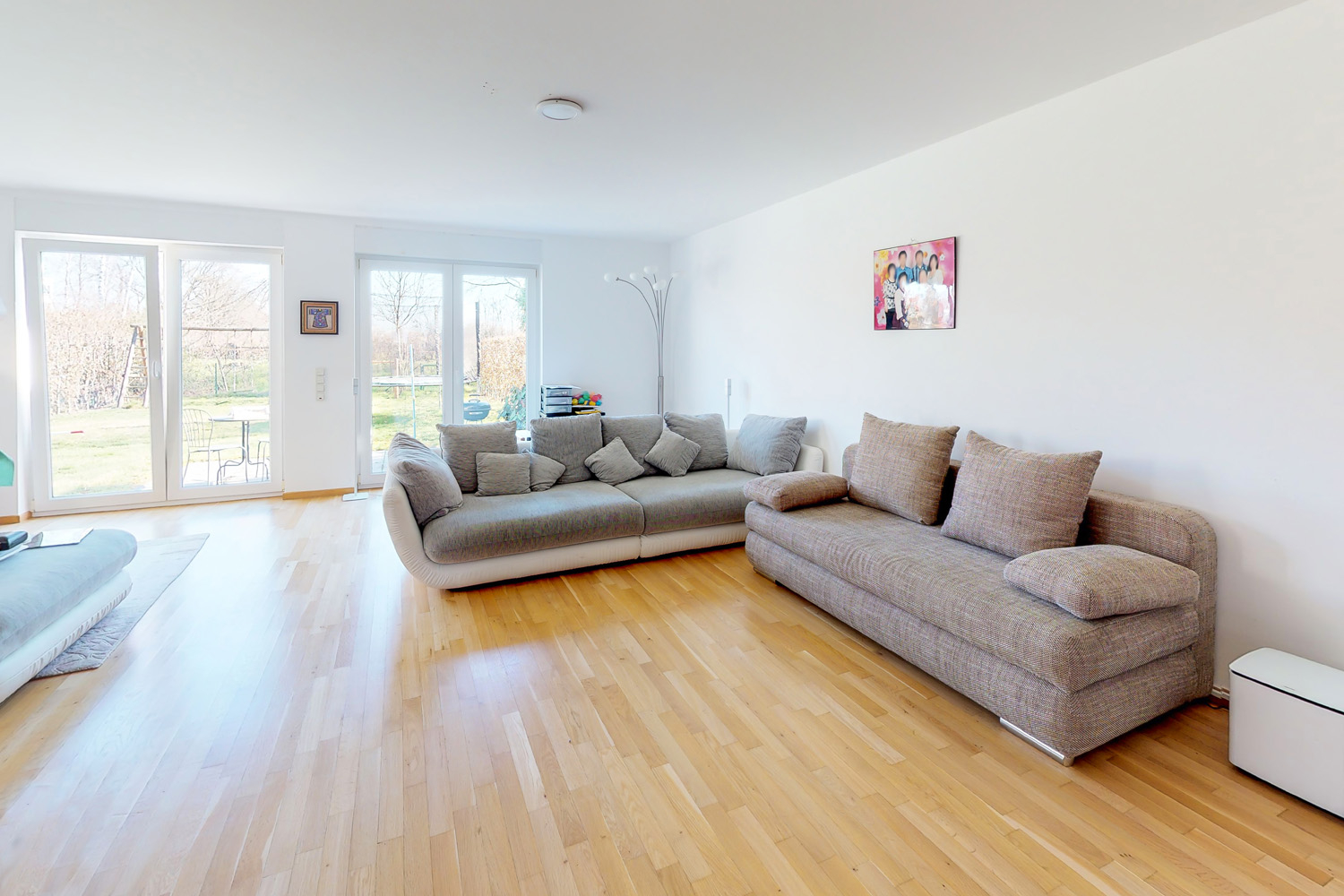 Ihr neuer Lebensmittelpunkt wird wohl das helle Wohnzimmer werden. Raumhohe Fenster lenken den Blick direkt nach draußen in den Garten, der bereits mit Spielgeräten für Ihre Kinder gespickt ist. An das Wohnzimmer anschließend finden Sie die Küche mit weißer Einbauküche. Hier können Sie das Essen vorbereiten und gleichzeitig die Kinder bei Ihren Schulaufgaben beaufsichtigen.