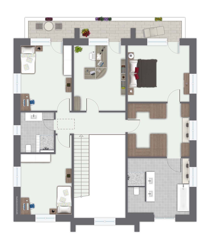 Die Räume im Obergeschoss sind alle über die luftige Galerie zu erreichen. Drei Zimmer mit ähnlicher Größe (ca. 17 m²) liegen auf der linken Seite des Hauses, ebenso ein Tageslichtbad mit Dusche. Auf der rechten Seite finden Sie die Elternsuite vor. Durch die geräumige Ankleide betreten Sie links den Schlafbereich und rechts das große Wellnessbad. Das Licht fällt von drei Seiten in dieses Raumarrangement. Entspannen Sie hier in den warmen Schaumblasen Ihrer Whirlpoolwanne oder mit einem guten Buch auf Ihrem Bett mit freiem Blick über Ihren Garten. Dieser Bereich des Hauses ist Ihr ganz privates Refugium. Sie treten von drei Zimmern aus auf den wunderschönen Balkon mit Blick auf die Gartenlandschaft.