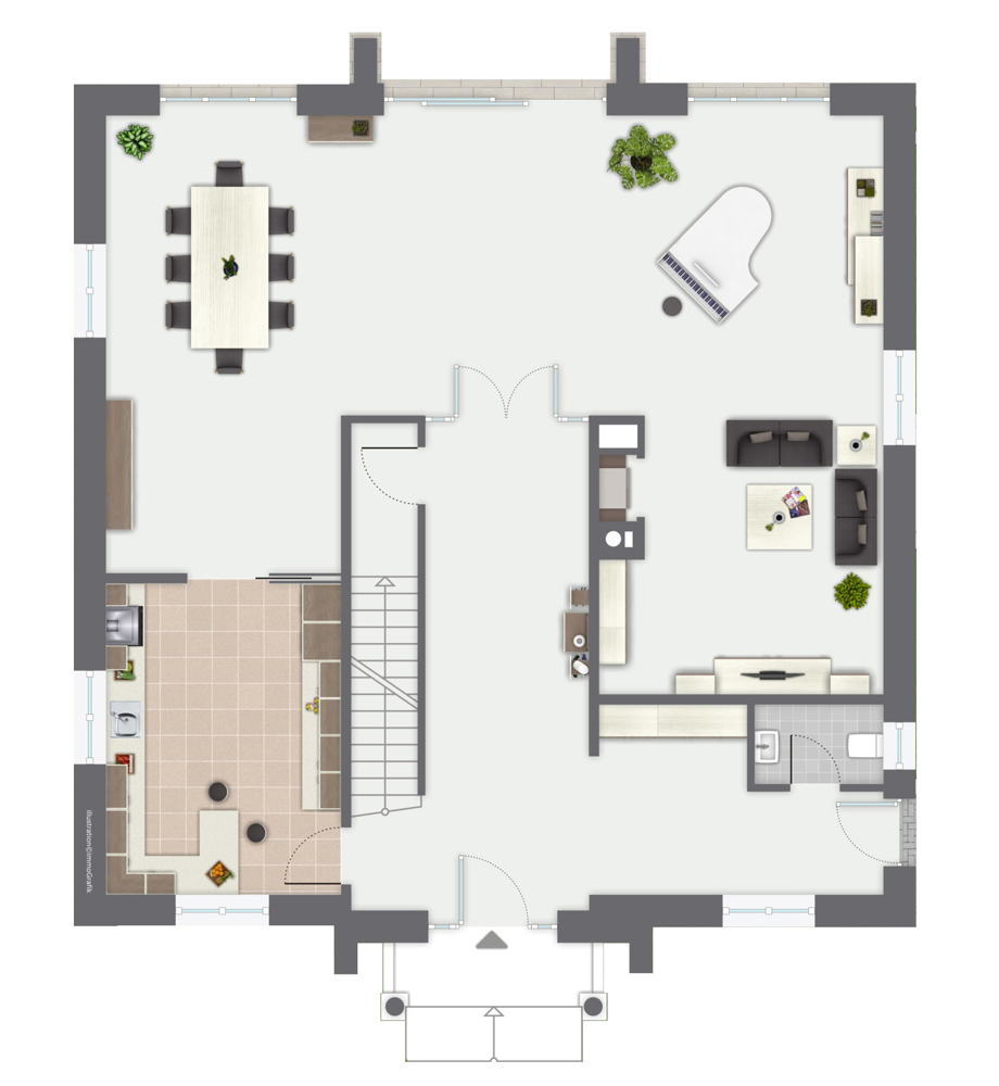 - Licht durchflutete Wohnräume mit großen Fensterelementen
