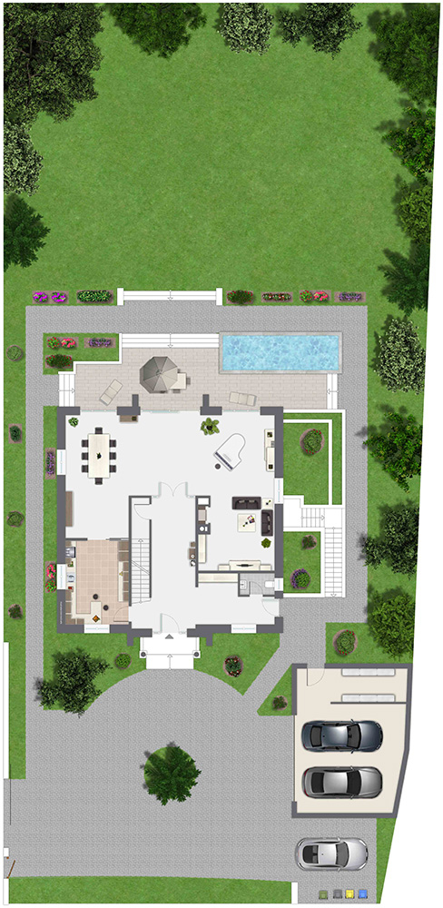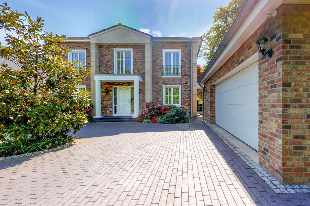 Eine leichte Frühlingsbrise weht über die grünen Hügel des Niederbergischen Landes durch die versteckte Privatstraße. Sie umschmiegt den imposanten Klinkerbau mit einem Hauch von Sommerträumen. Die großen Schwingtore öffnen sich und vor Ihnen erhebt sich das weiße Eingangsportal der im Stile eines englischen Landhauses gehaltenen Villa. Sie parken Ihr Auto in der Garage und schon verschließt sich leise die Toranlage zum Grundstück wieder hinter Ihnen. Gerade einmal 20 Minuten haben Sie von der Königsallee bis hierher benötigt.