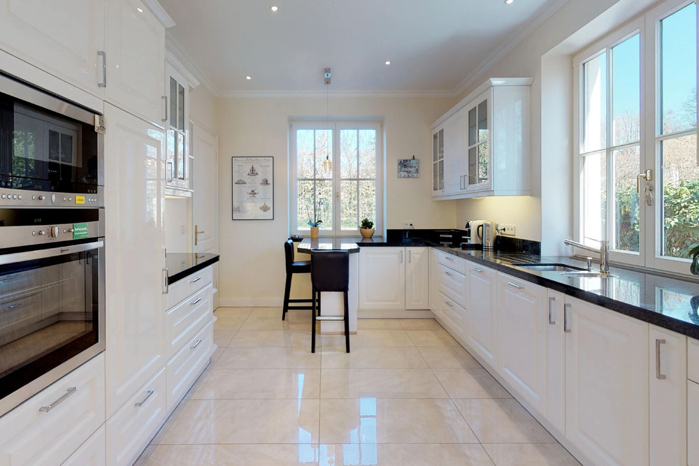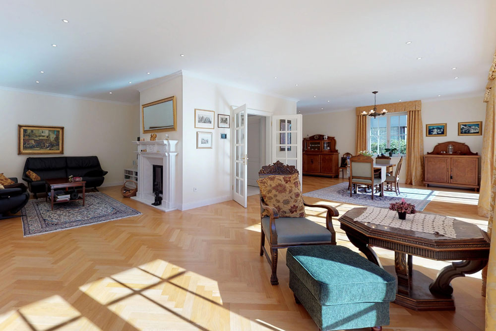 Die klassisch gehaltene Landhausvilla beeindruckt zum einen durch ihre moderne technische Ausstattung, zum anderen aber auch durch ein raffiniertes offenes Raumkonzept, welches nicht nur einer großen Familie gerecht wird. Raumhohe Fensterelemente geben den Blick frei in Ihren hochwertig angelegten uneinsichtigen Garten. Das warm leuchtende Fischgrätparkett und der Kamin schenken dem Raum ein gemütliches Ambiente, so dass Sie und Ihre Familie sich hier auch an kühleren Tagen wohlfühlen. Zusammen im Fernsehbereich kuscheln oder doch am großen Esstisch gemeinsam speisen, hier haben Sie genug Platz zum Leben. Die großzügige Küche grenzt direkt an den Essbereich und kann über eine Schiebetür abgetrennt werden. Allein Sie entscheiden, ob Sie eine offene Küche bevorzugen oder nicht.