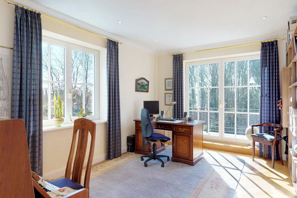 Durch die zweigeschossige Eingangshalle tanzen leuchtende Lichtstrahlen aus allen Himmelsrichtungen. Über Ihnen hängt der Kronleuchter in luftiger Höhe. Hier empfangen Sie ab jetzt Ihren Besuch standesgemäß und können ihn durch die Doppelflügeltür in Ihr ca. 85 m² großes Wohnzimmer geleiten.