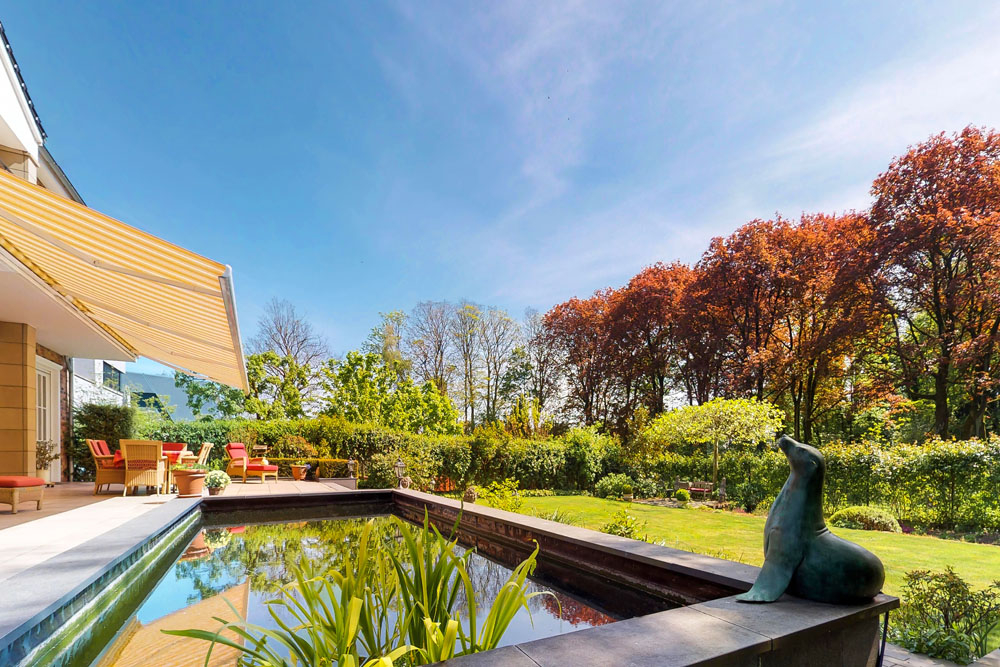Sobald das Wetter wärmer wird, öffnen Sie die großen Glaselemente des Wohnzimmers und lassen Drinnen und Draußen ineinander verschmelzen. Genießen Sie Ihre Sonntagsbrötchen und herrlich süß duftende Croissants unter freiem Himmel mit Blick auf die Naturkulisse mit Parkcharakter. Der an die Terrasse angrenzende, große Teich kann mit seinen 1,60 m Tiefe auch zum Schwimmbad umfunktioniert werden. Kois oder Planschparadies für Ihre Kinder im Sommer, die Entscheidung können wir Ihnen nicht abnehmen.