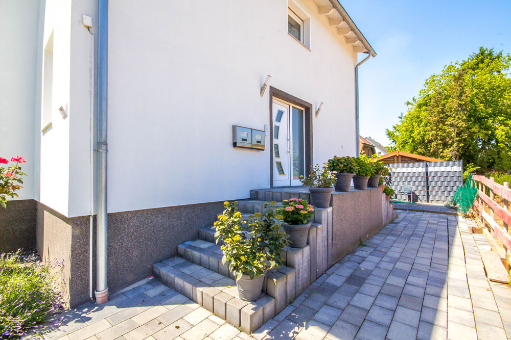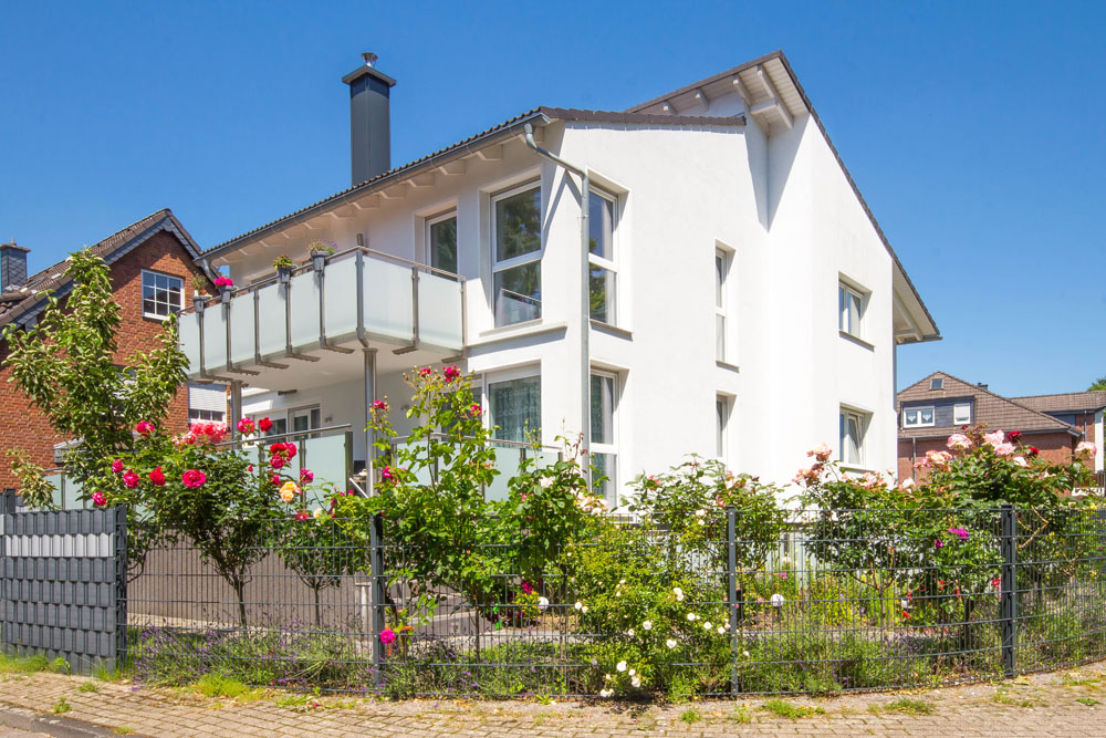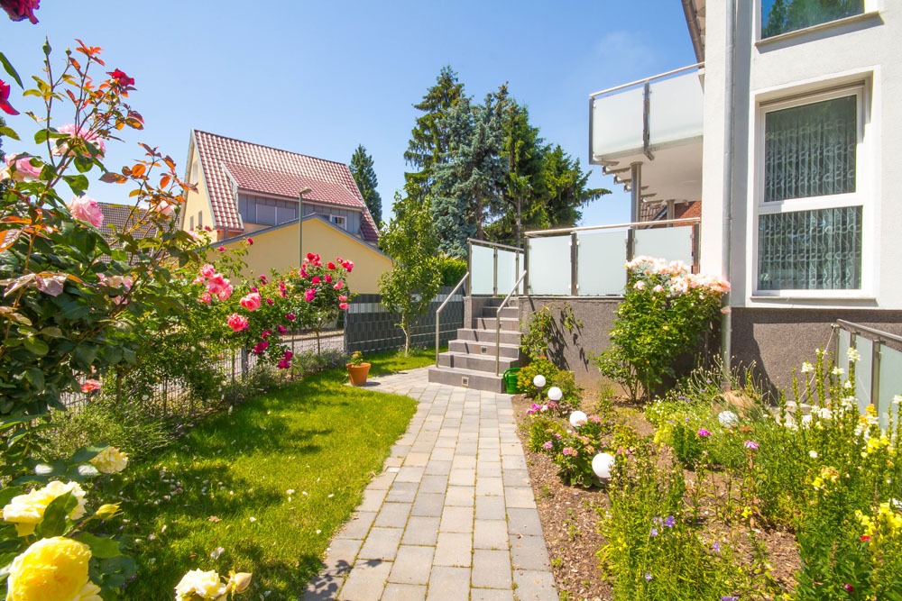 Bunte Rosen und Stauden begrüßen Sie bereits beim Betreten des Grundstückes, während die Sonne von der weißen Fassade Ihnen hell entgegen reflektiert. Der Garten läuft einmal um das Haus herum. Pflegeleicht mit verschiedenen Terrassen und Balkonen angelegt, haben Sie kaum Arbeit mit den Beeten und Rasenflächen und doch ist er groß genug, um etwas Grün am Wochenende zu genießen.