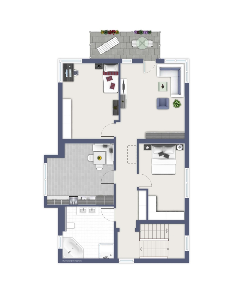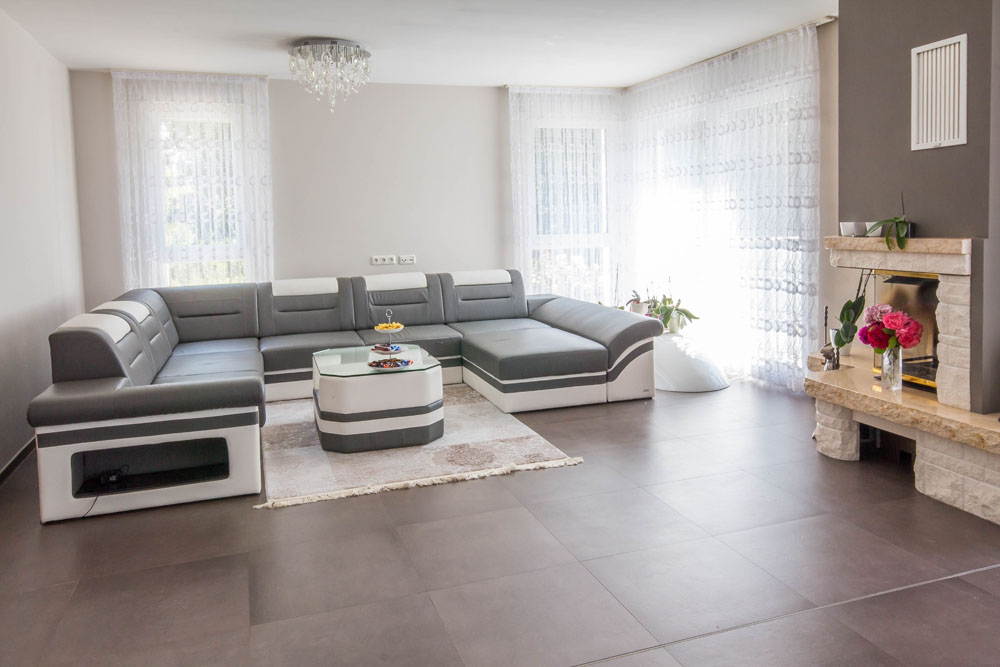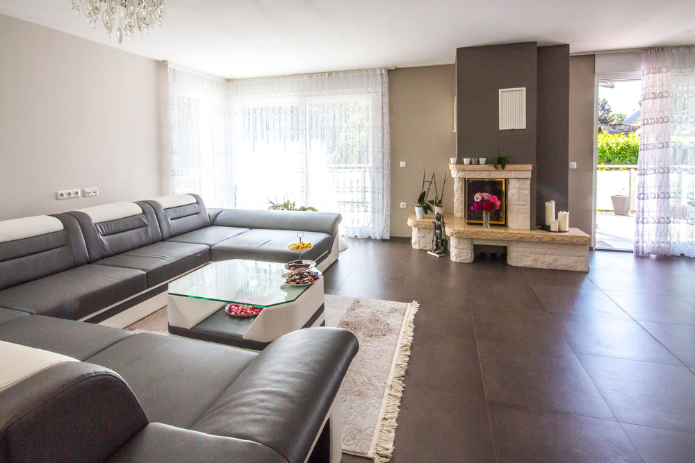 Als Einfamilienhaus wird Ihr neues Erdgeschoss zur großzügigen Wohnebene. Die offene Küche ist mit einer weißen Hochglanzküche und Kochinsel ausgestattet. Im Wohnzimmer finden Esstisch und große Eckcouch problemlos einen Platz. Und der Kamin gibt dem ganzen Raum an kühlen Tagen mit seinem flackernden Feuer eine ordentliche Portion Gemütlichkeit.