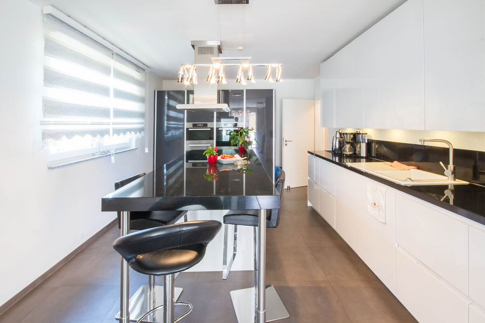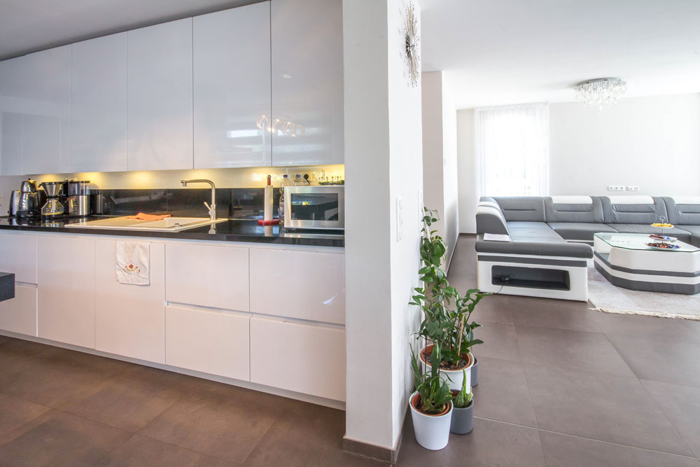 - hochwertige Einbauküche (weiss/hochglänzend/grifflos) mit Granitarbeitsplatte von Juma