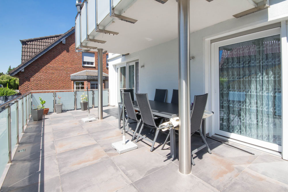 - Terrassen-/Balkongeländer und Treppenaufgänge aus Edelstahl mit Milchglas
