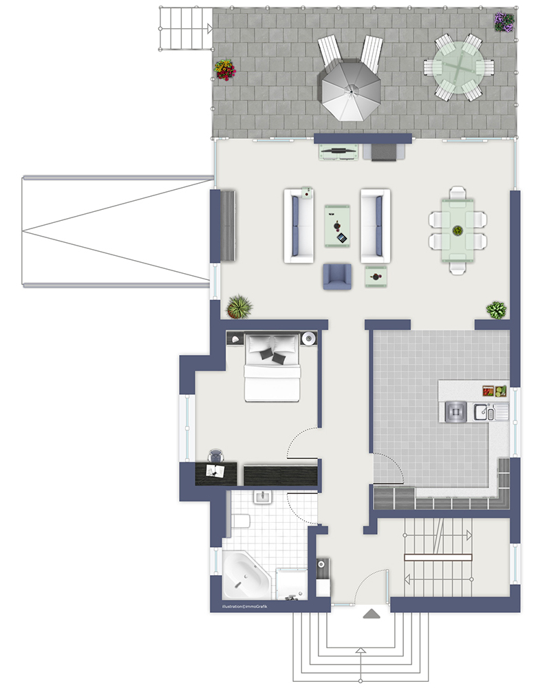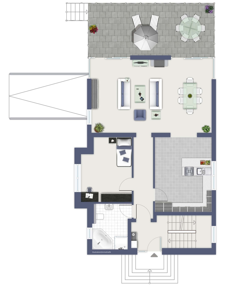 - Garten- und Terrassenfläche ist komplett eingezäunt und verläuft umlaufend um das Haus