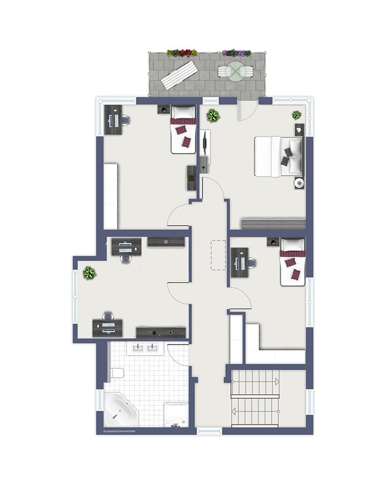 Das Obergeschoss wird Ihre Rückzugszone. Hier findet jedes Familienmitglied sein passendes Zimmer. Das Elternschlafzimmer verfügt dazu über einen eigenen Balkon. Lassen Sie den Tag hinter sich und schalten Sie hier in Ruhe ab.