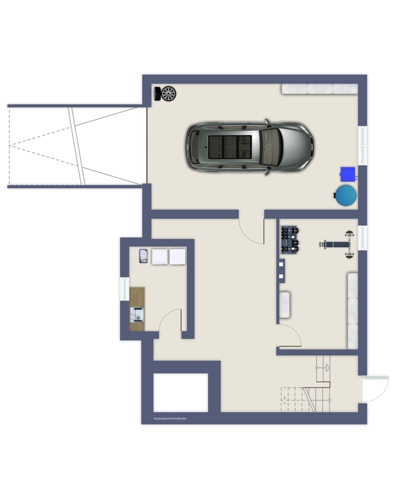 - große Garage (ca. 40 m²) mit elektrischem Tor und direktem Zugang zum Haus