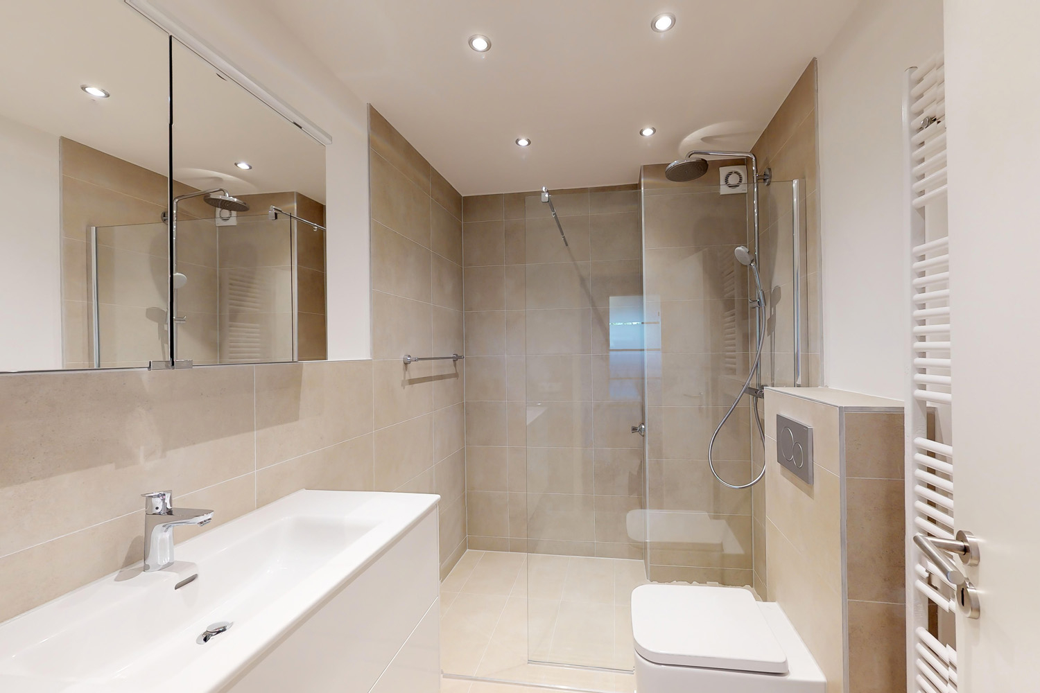 - Saniertes Duschbad mit Sandsteinfliesen und großem Waschtisch mit Einbauschubladen
