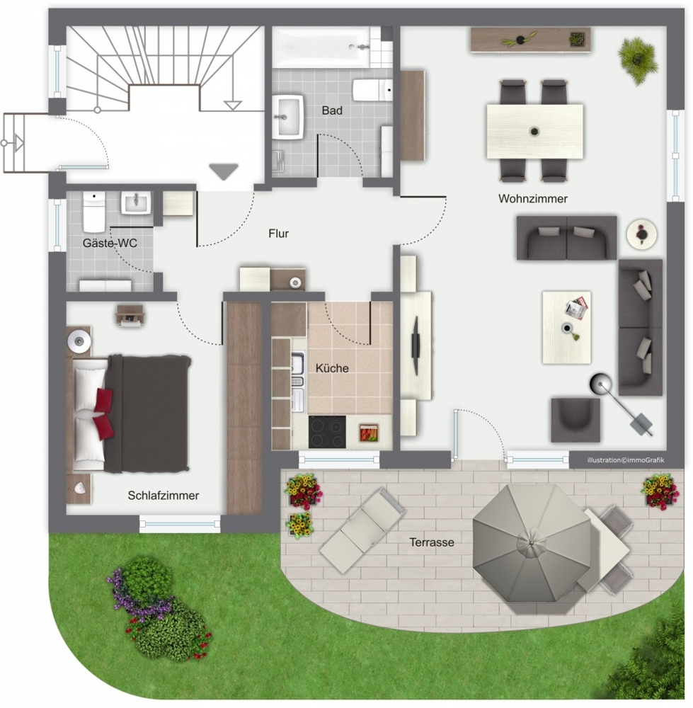 Ein besonderes Merkmal: Die Helligkeit der Wohnung! Durch ihre Fenster nach drei Himmelsrichtungen und ihre Milchglas-Türen fällt viel Licht ein. In den warmen Frühling-und Sommertagen können Sie gemütlich auf der Terrasse sitzen, grillen und plaudern.