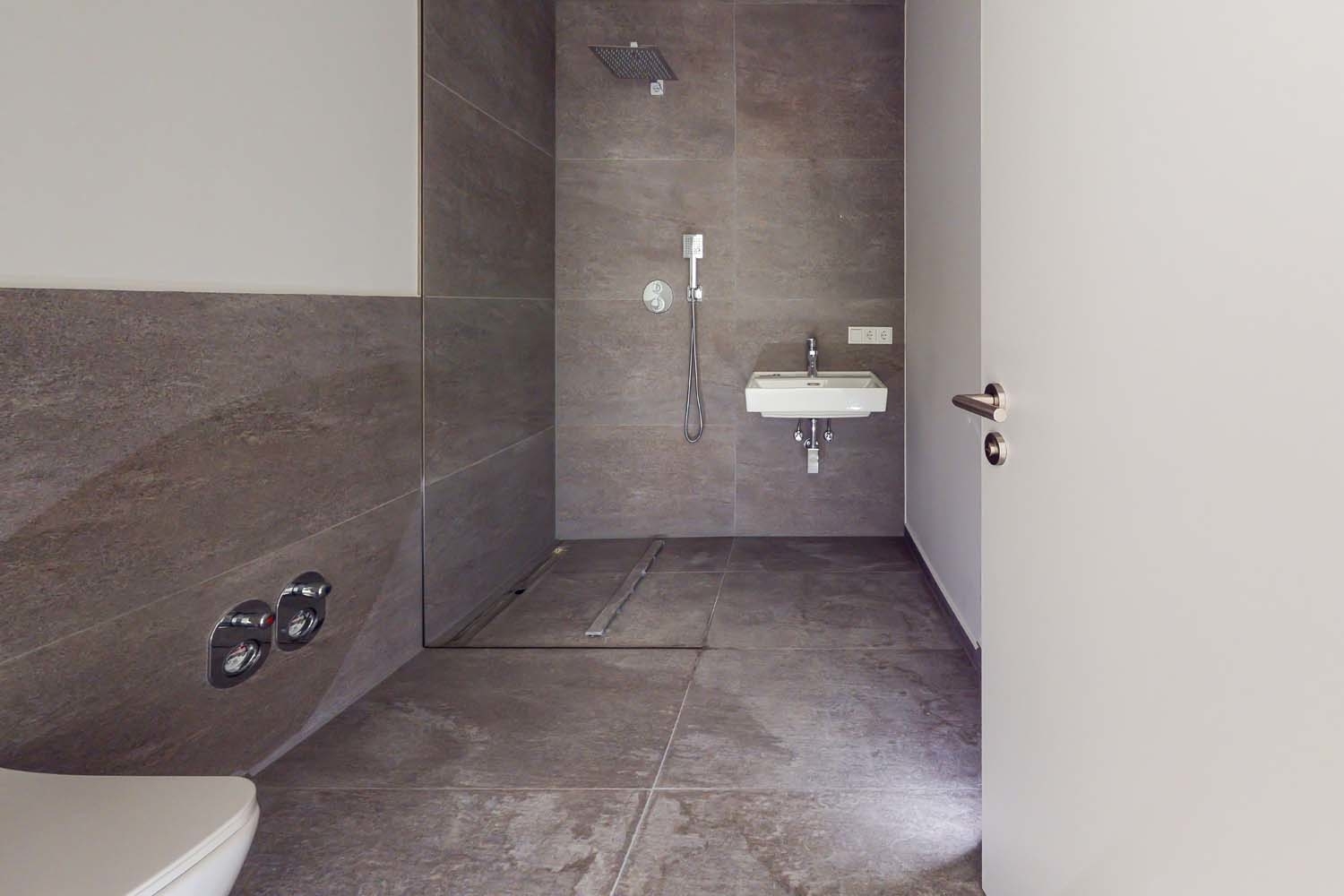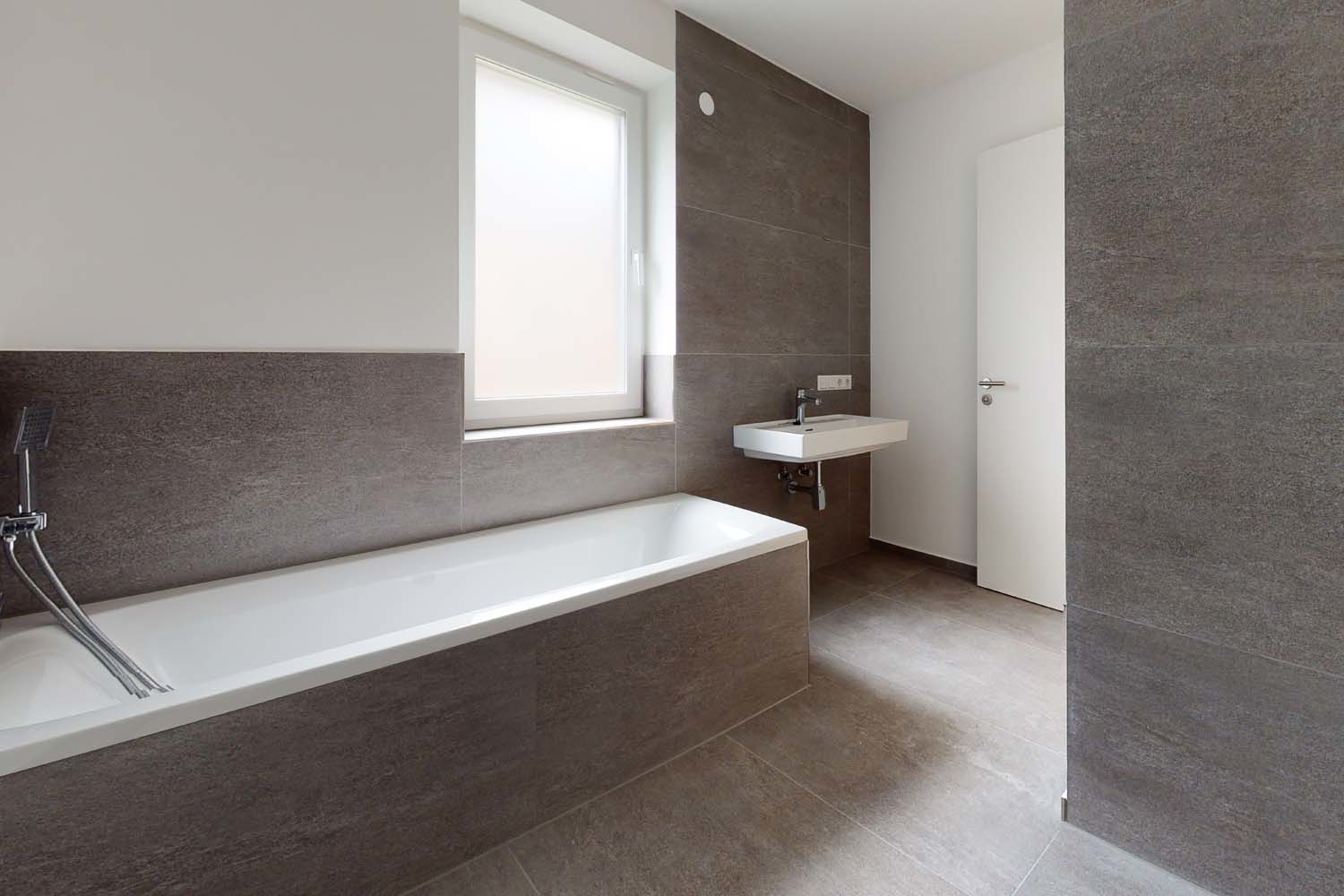 … mit 120 x 60 cm großen Feinsteinzeug-Fliesen (Boden- und Wandfliesen) gemäß Farbkonzept