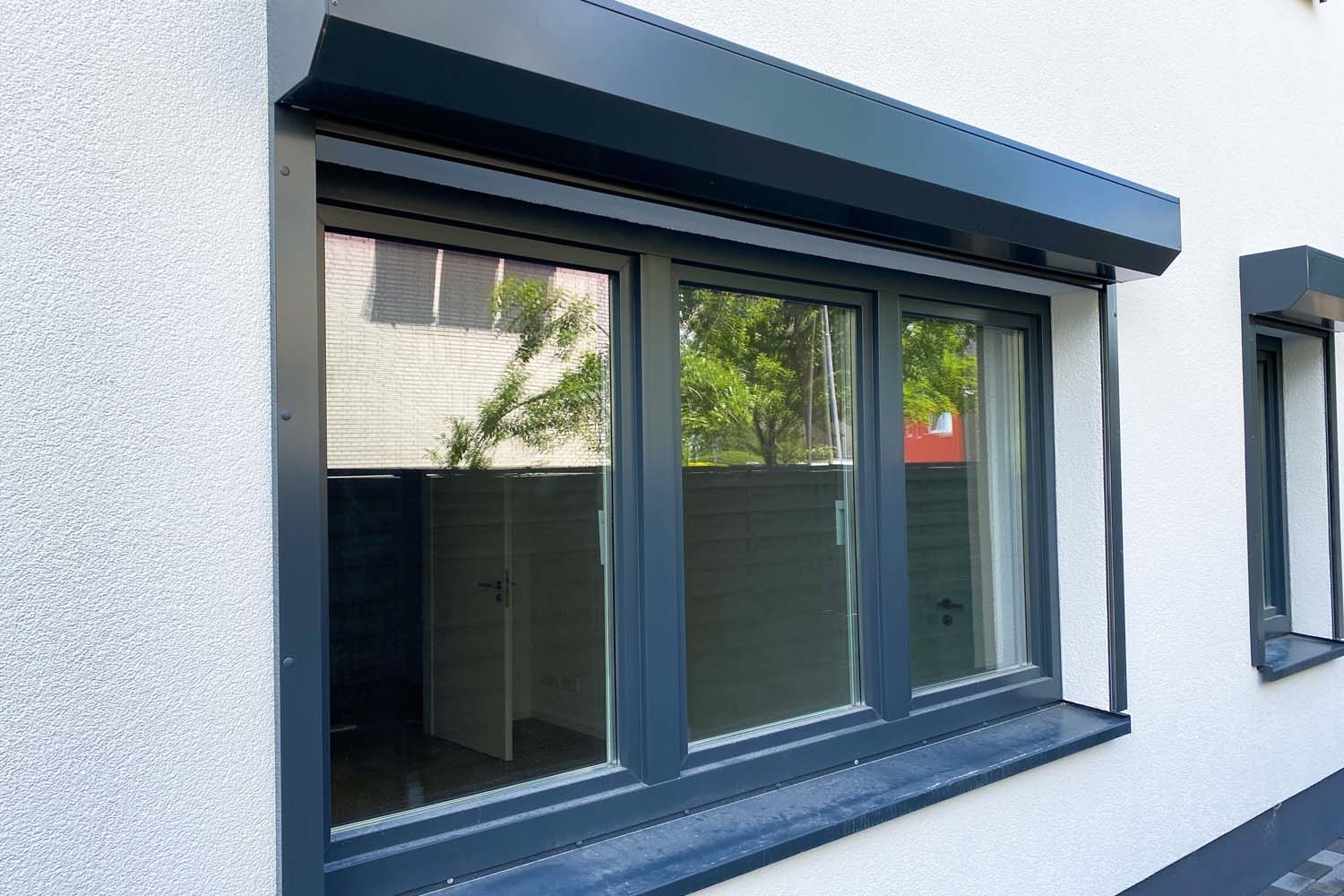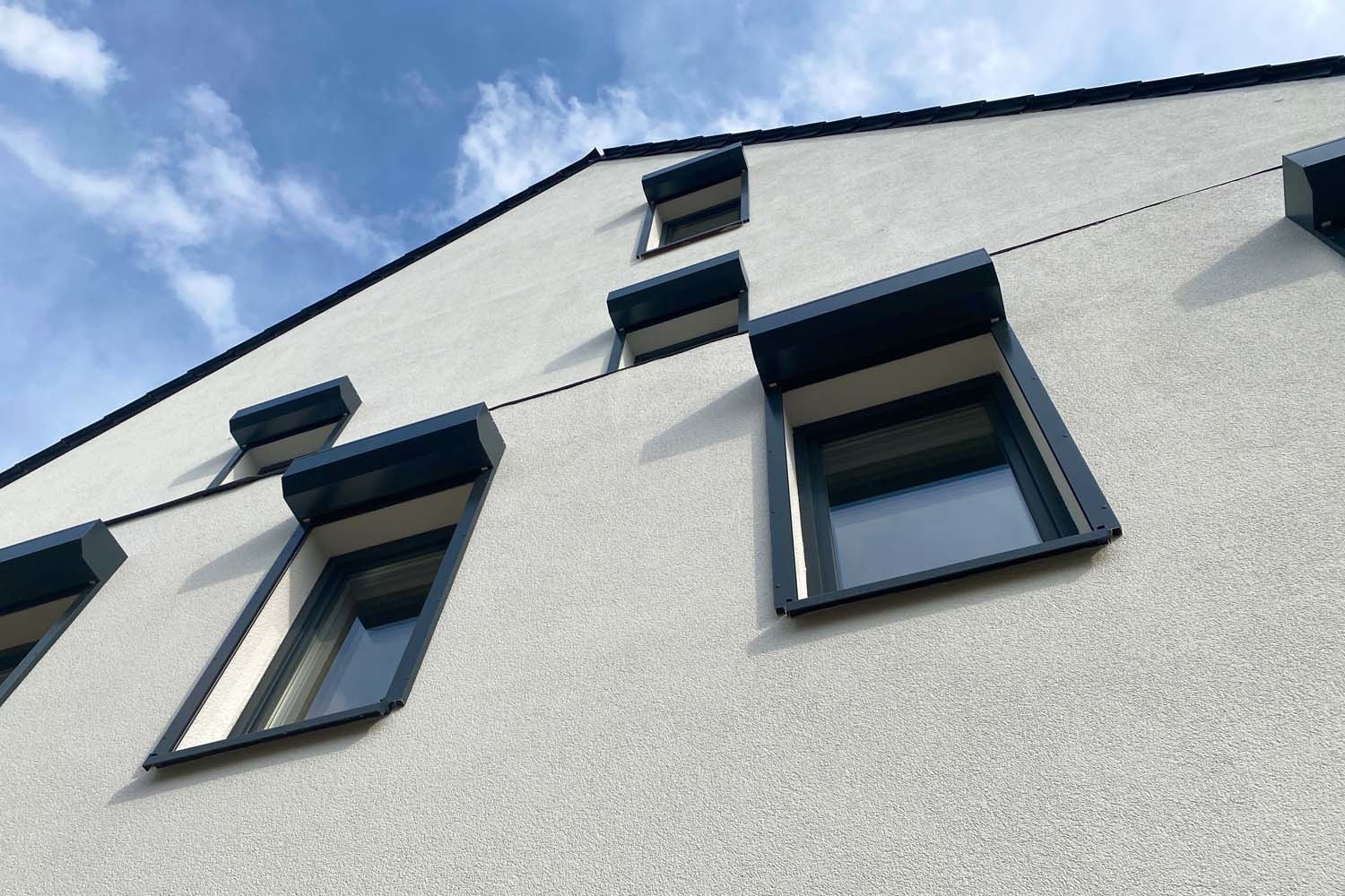 - Fenster: 3-fach Verglasung in Kunststoffrahmen (außen grau & innen weiß) mit Fensterfalzlüfter und elektrischen Aluminium-Rollläden