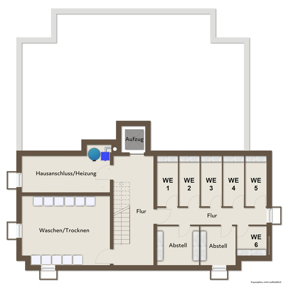 Im Kellergeschoss gibt es, neben einzelnen Kellerräumen je Wohneinheit, noch einen großen Raum, in dem Sie Ihre Wäsche waschen und trocknen können.