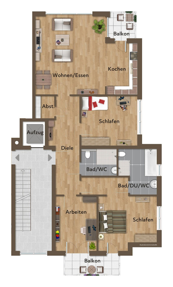 Zur Erholung an der frischen Luft steht Ihnen ein zur Gartenseite ausgerichteter Balkon zur Verfügung. Zudem gibt es einen weiteren Balkon, der nach vorne zur Straßenseite ausgerichtet ist. Auf den großen Balkonen können Sie die schönsten Stunden des Tages verbringen oder den Feierabend entspannt ausklingen lassen. Lassen Sie die Hektik des Alltags für einen wohltuenden Augenblick hinter sich und genießen Sie schon bald Ihren neuen, sorgenfreien Lebensabschnitt in Ihrem neuen Zuhause!