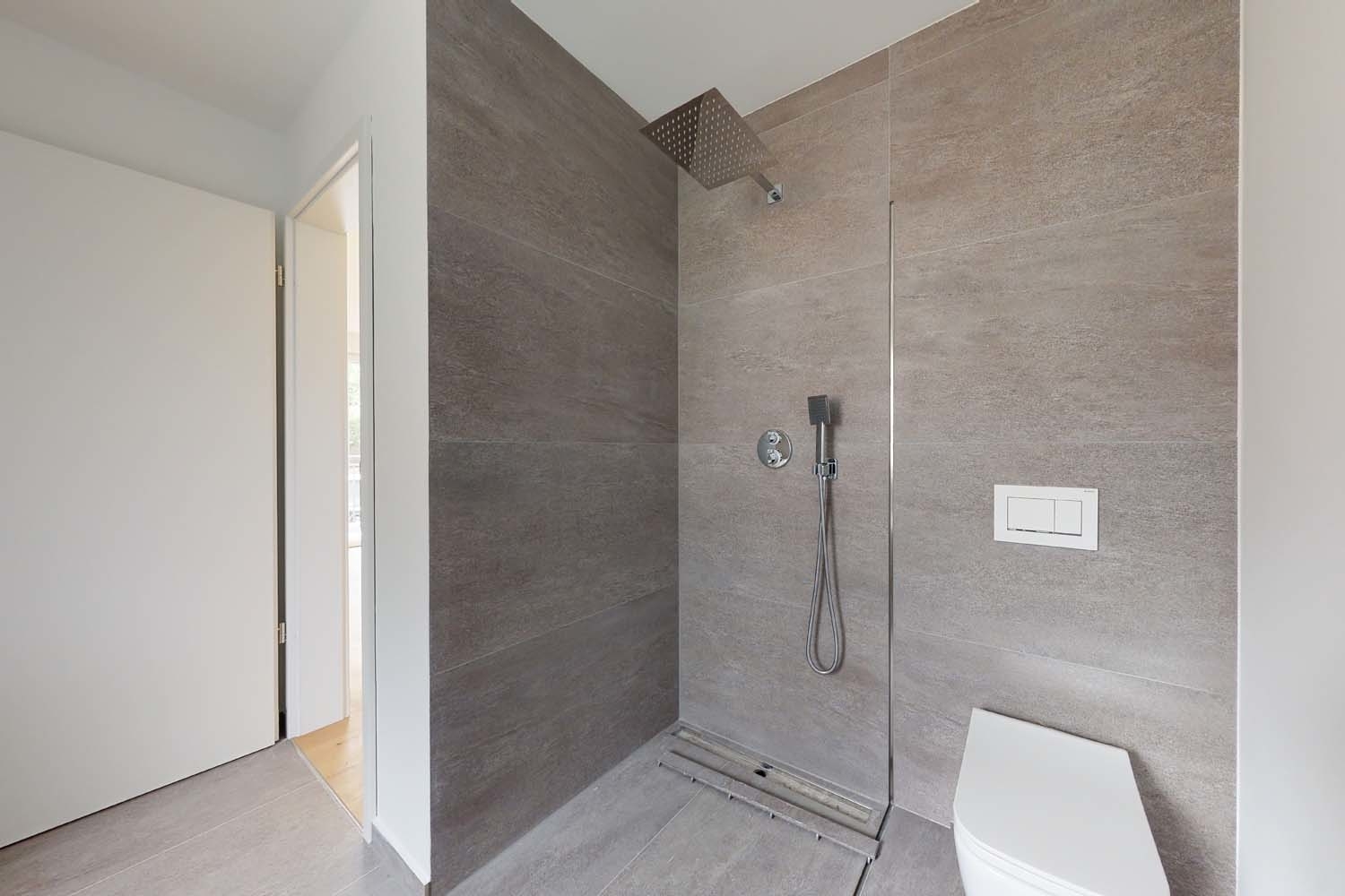 … ebenerdige Dusche mit großer „Rainshower“ und zusätzlicher Handbrause sowie Echtglasabtrennung, Badewanne, WC, Waschbecken und Handtuchheizkörper