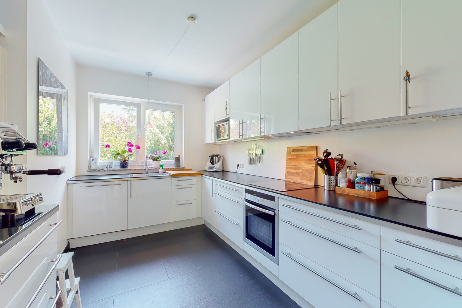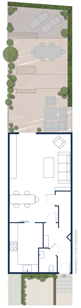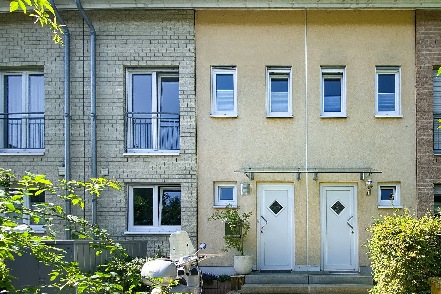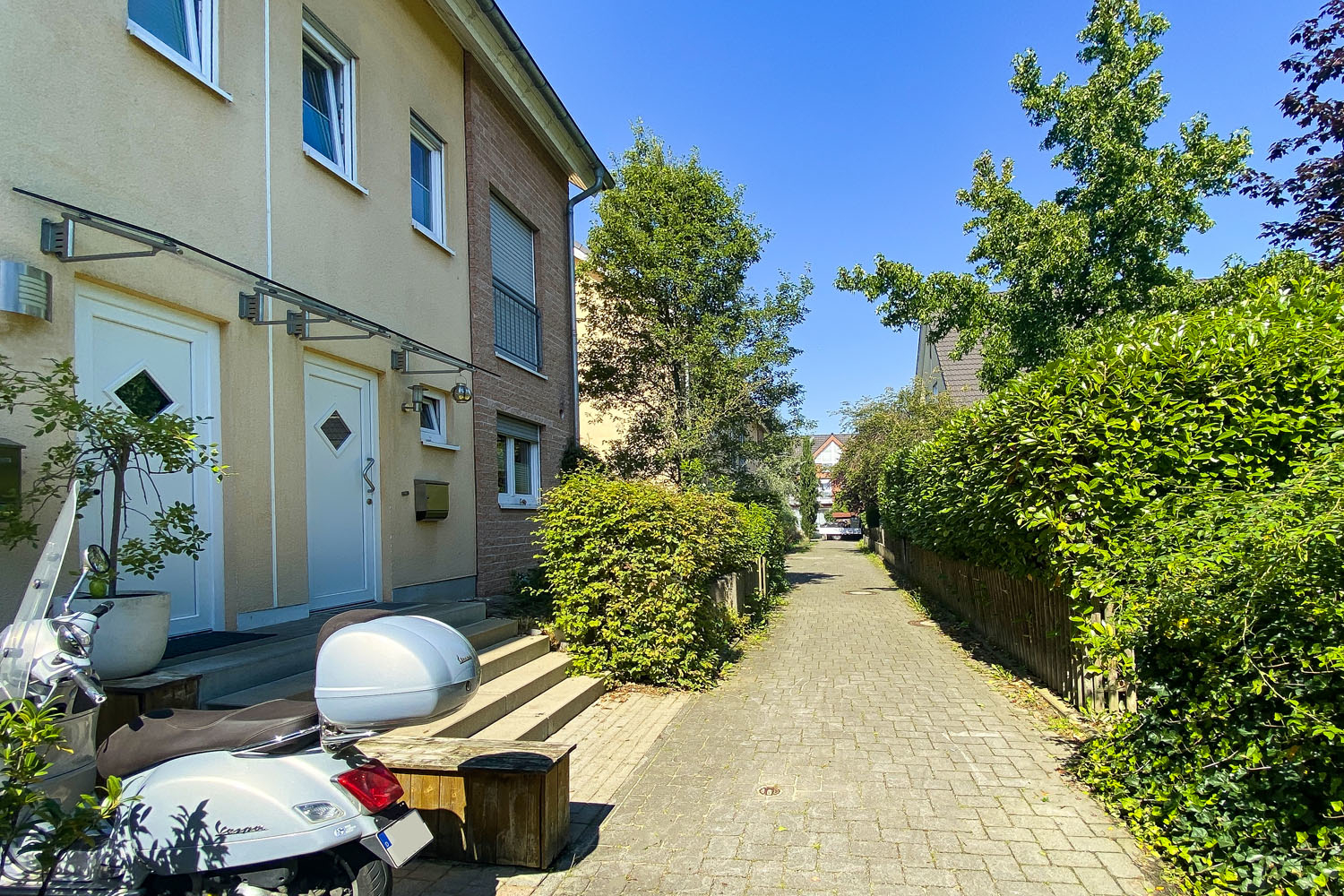 An einem ruhigen Stichweg gelegen, empfängt Sie dieses Haus mit einer hellen und ansprechenden Fassade. Der Vorgarten ist pflegeleicht und gleichzeitig einladend gehalten. Hier können Fahrrad oder Vespa direkt vor der Tür abgestellt werden. Ins satte Grün der Natur blicken Sie bereits von der Eingangstür und der daneben liegenden Küche. Aber treten Sie zunächst durch die weiße Eingangstür hinein und verschaffen Sie sich einen eigenen Eindruck von dem ansprechendem Wohnambiente auf mehr als 140 m² Wohnfläche.