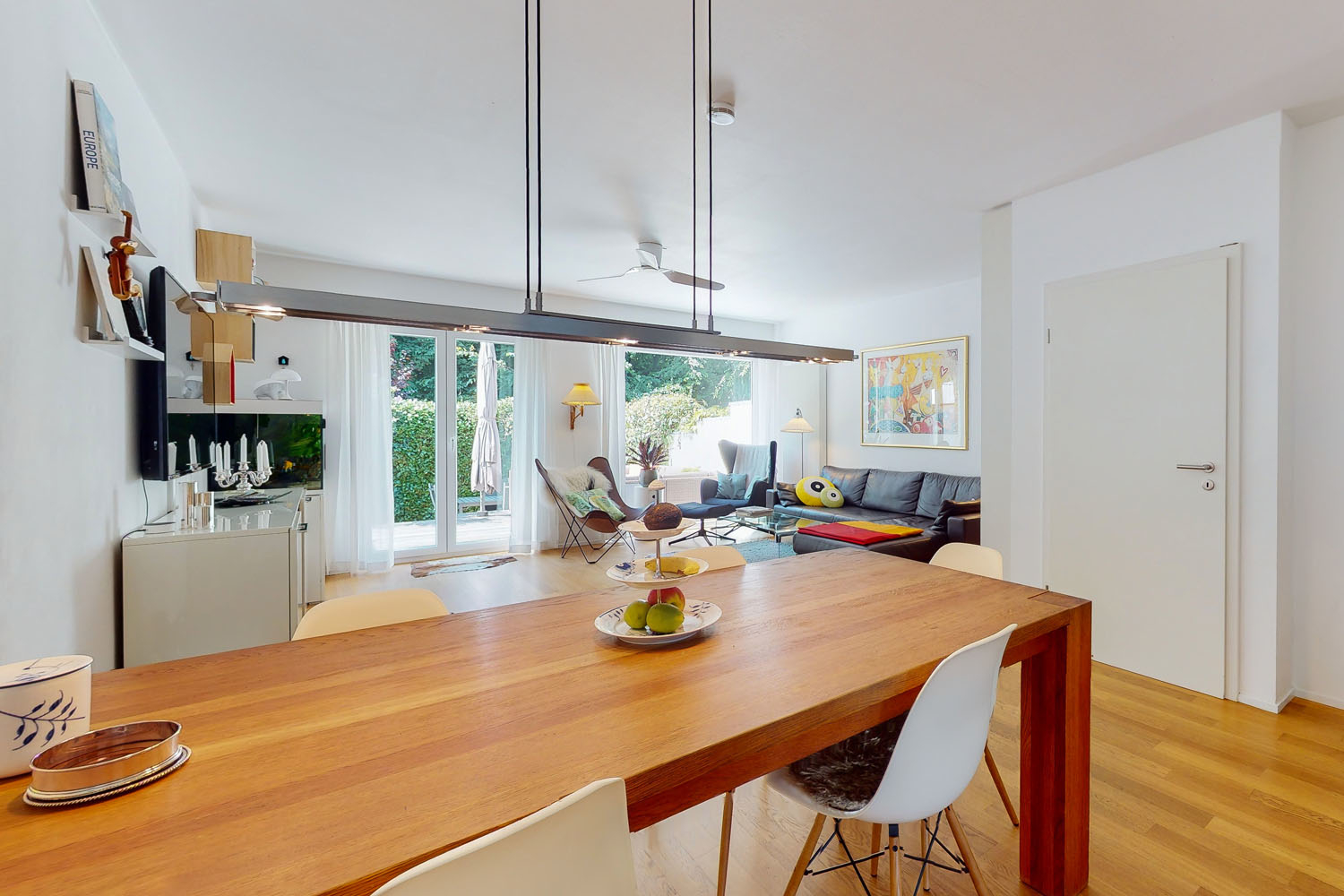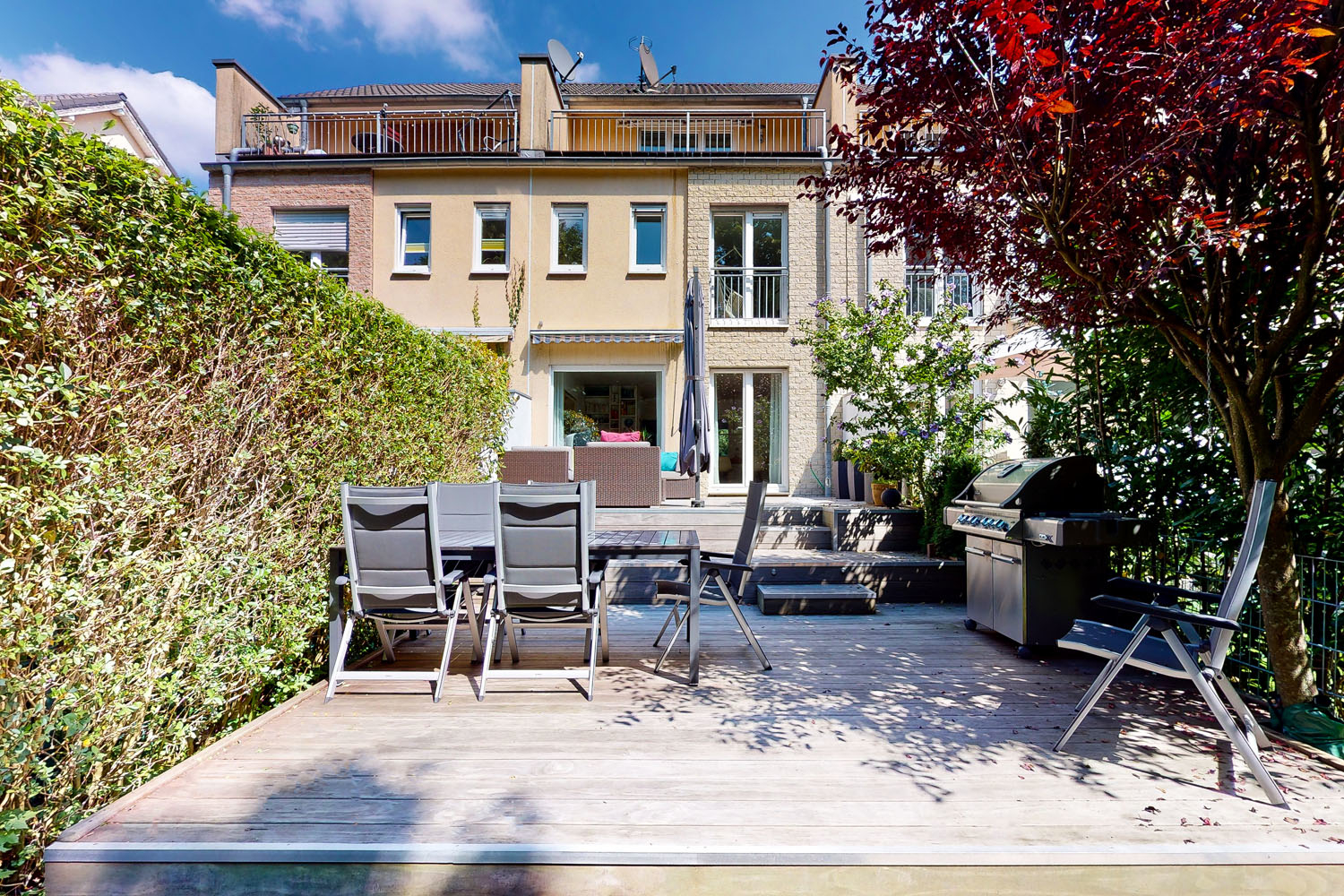 Die Erdgeschossebene ist in jeder Hinsicht passend auf das moderne Familien-Leben zugeschnitten. Die Küche ist zeitlos und geschmackvoll und grenzt direkt an den Essbereich des Wohnzimmers. Das durch die großen Fenster einfallende Tageslicht spiegelt sich auf dem Parkett im Wohnbereich und verleiht dem gesamten Raum eine äußerst angenehme Atmosphäre. Bei freundlichem Wetter und im Sommer freuen Sie sich besonders über die zwei großen Terrassen in idealer Südwest-Ausrichtung, die dieses Haus zu bieten hat. Eine hohe Randbepflanzung bietet Sichtschutz und wertvolle Privatsphäre. Stellen Sie Liegestühle auf, werfen Sie den Grill an und genießen Sie den Sommer unter freiem Himmel!