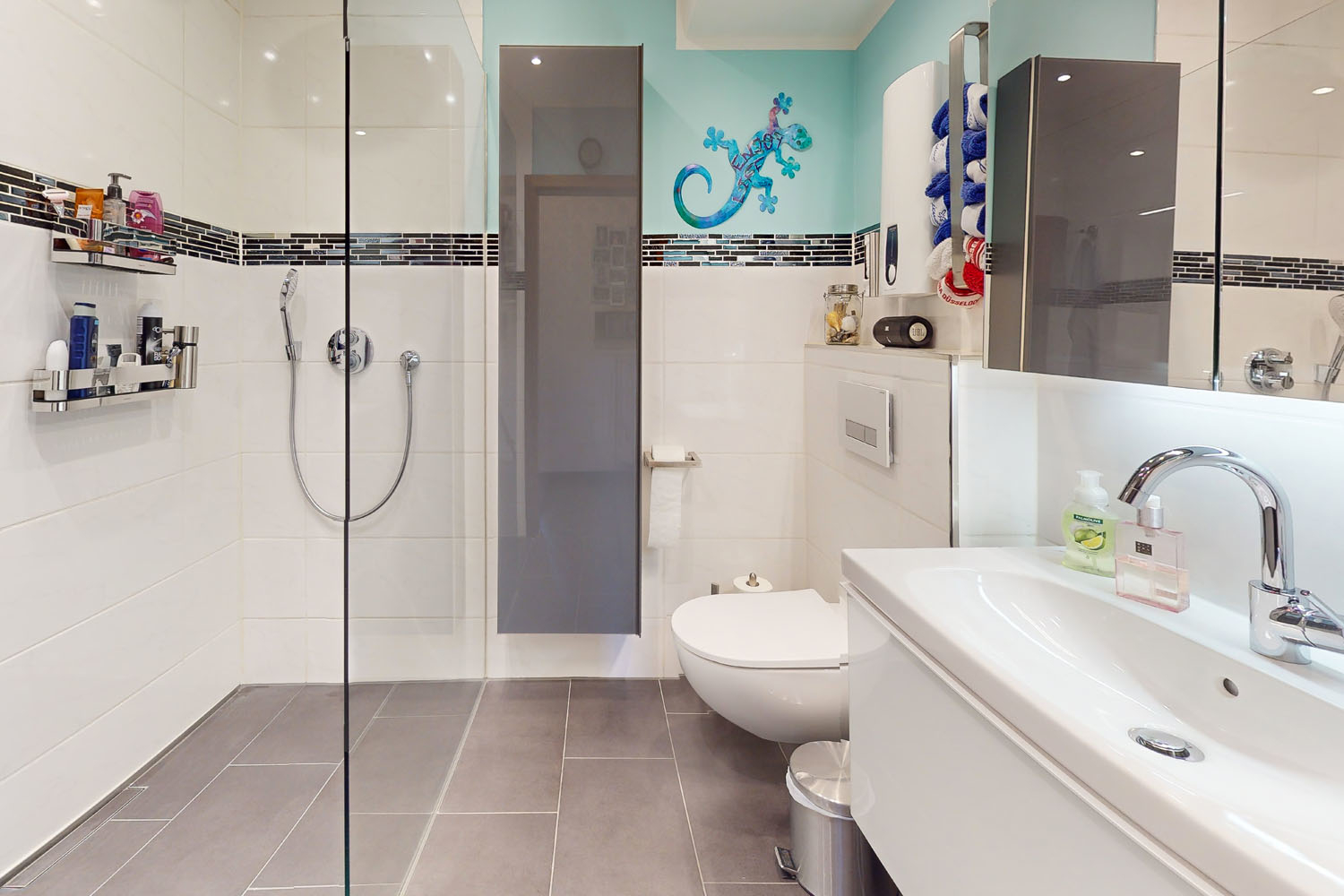 Im Badezimmer erleben Sie eine Wohlfühloase mit begehbarer Dusche und Fußbodenheizung.