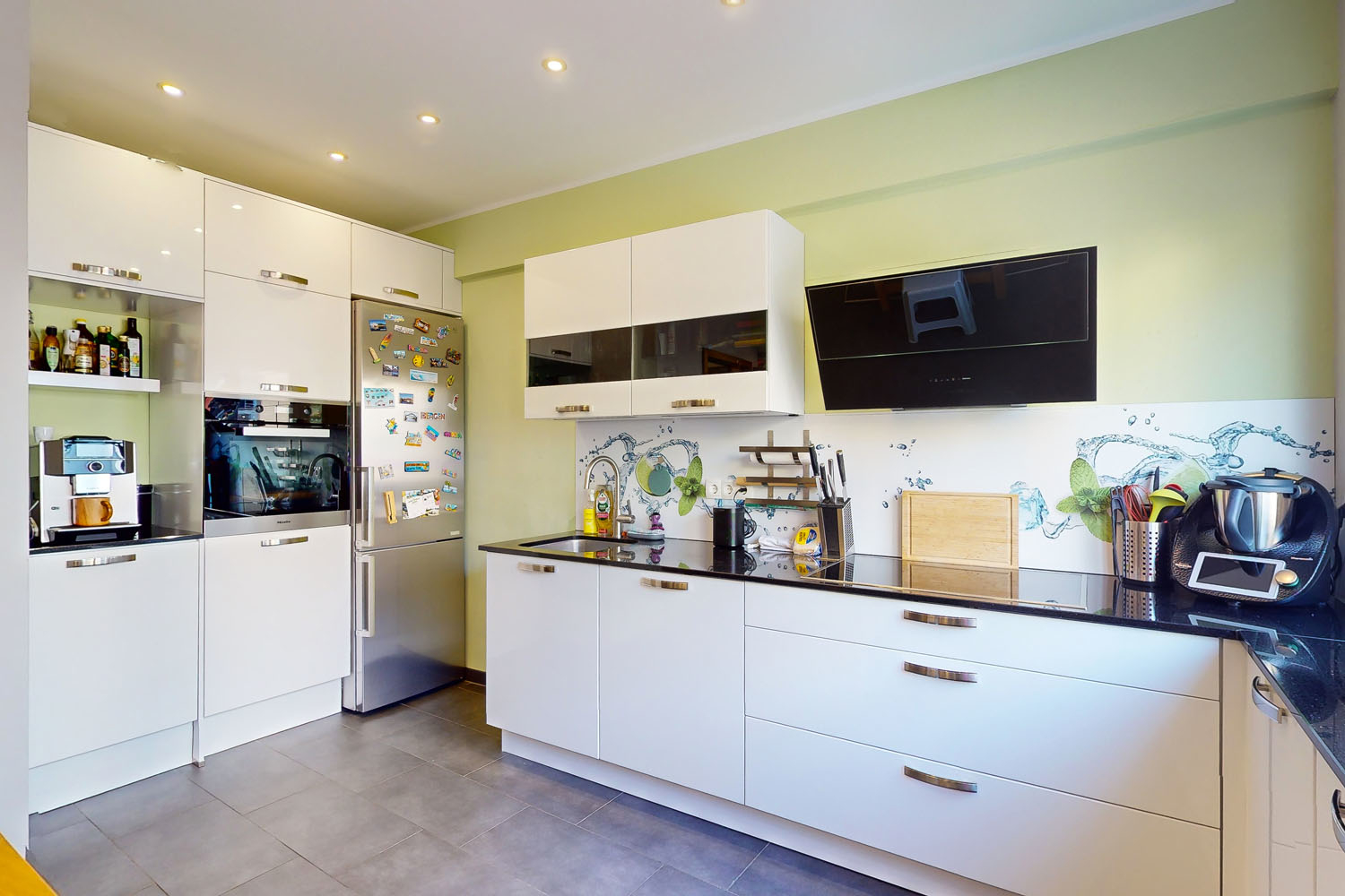 Die Küche grenzt direkt an das Wohnzimmer an und erlaubt Ihnen eine optimale Bewirtung Ihrer Gäste, ohne dass Kochdüfte den Wohnbereich erreichen. Die hochwertige und moderne Einbauküche ist mit Markengeräten ausgestattet, einschließlich einer integrierten Waschmaschine.