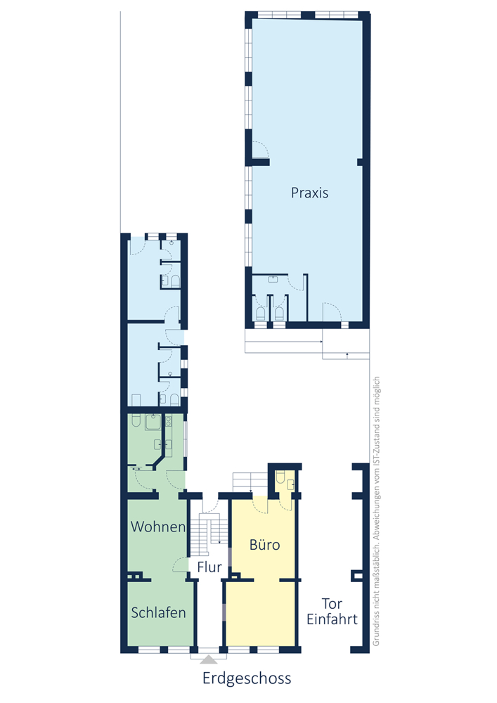 Im 2-geschossigen Haupthaus befinden sich 5 Einheiten. Durch die Toreinfahrt gelangen Sie auf den hinteren Grundstücksteil mit dem Nebengebäude und den sehr großen Garten.