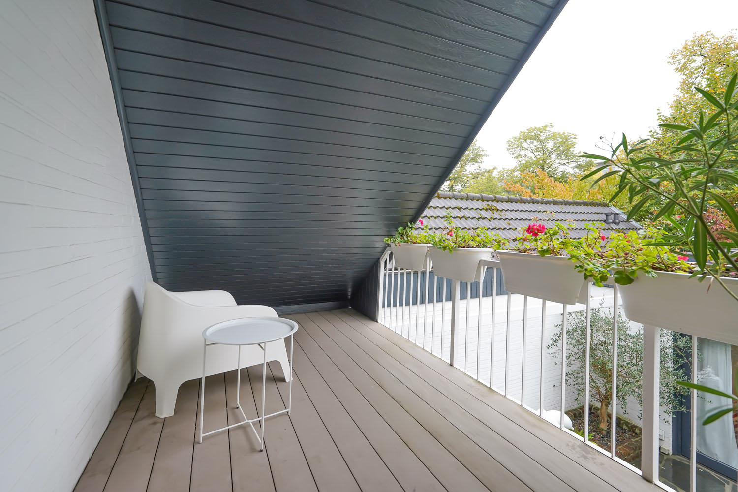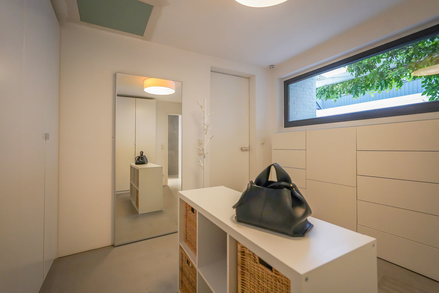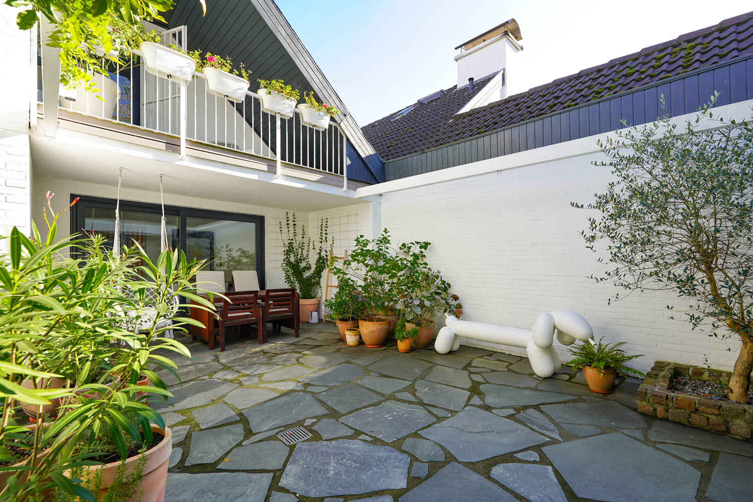 Schon von außen wirkt das Haus durch seine zeitlose weiße Fassade einladend. In der ca. 16 m² großen Garage finden sowohl Auto als auch Fahrräder Platz. Die kleine Terrasse vor der Haustür lädt zu einem entspannten Frühstück im Freien ein. Eine dicht gewachsene Hecke in weiß gemauerten Pflanzkästen bietet natürlichen Sichtschutz und sorgt für Privatsphäre. Dank der Ausrichtung nach Osten genießen Sie hier die ersten Sonnenstrahlen des Tages.