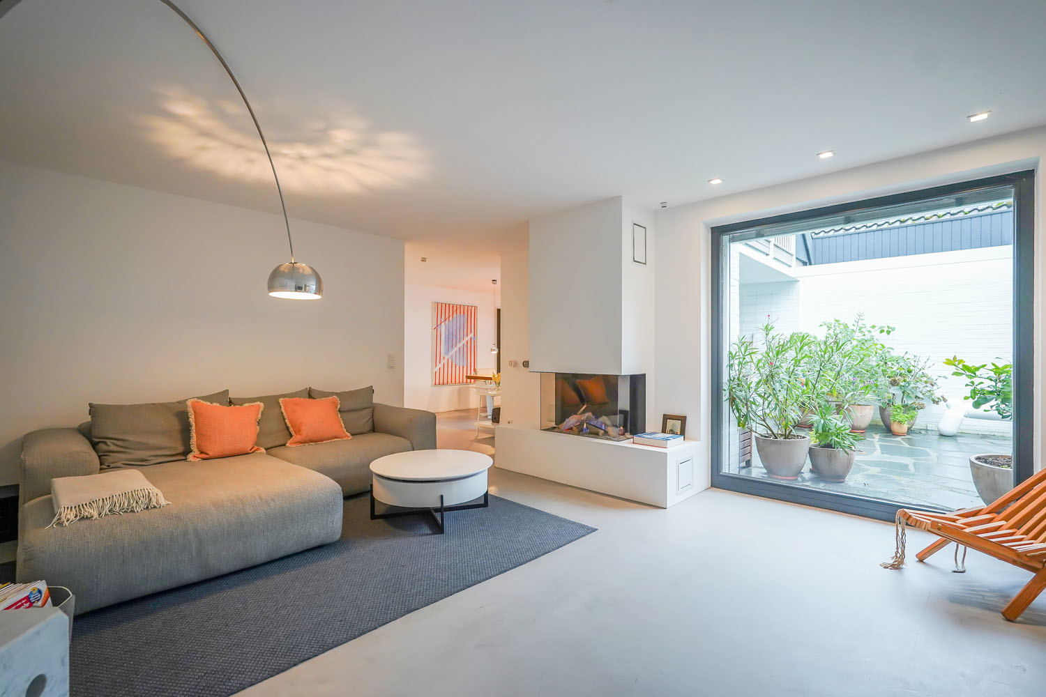 Der Panoramablick auf den Innenhof begeistert vom Wohnbereich und Schlafzimmer aus. Große Glasflächen verbinden Innen- und Außenräume und schaffen vielfältige Blickachsen. Hier, in diesem privaten Außenbereich, können Sie gemütlich einige Stunden im kühlen Schatten der überdachten Terrasse verbringen, oder aber auf Liegestühlen in der Sonne relaxen. Der Patio bietet sowohl schattige als auch sonnige Plätze zum Entspannen.