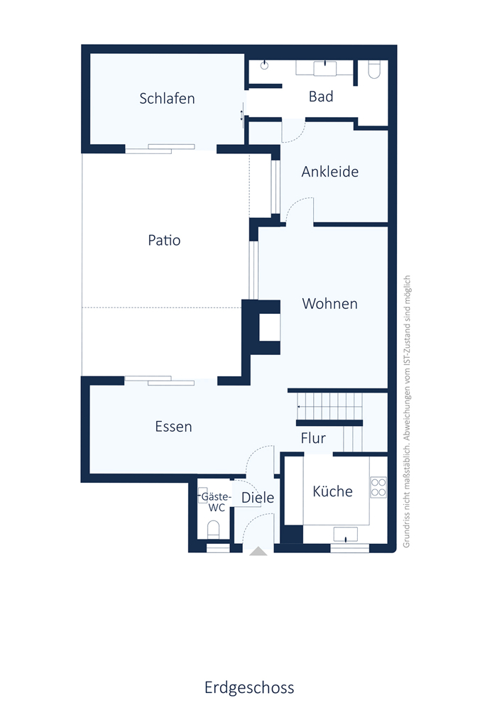 Komplettiert wird das Erdgeschoss durch die Küche, die Diele und ein Gäste-WC.