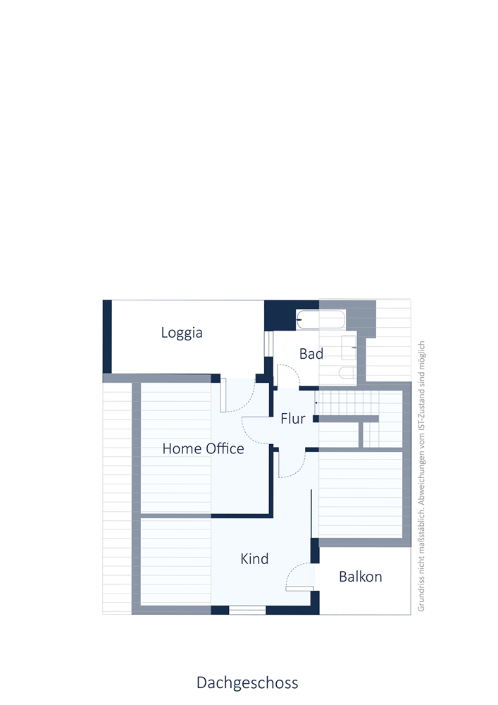Im Dachgeschoss befinden sich zwei weitere Schlaf-/Kinderzimmer (eins davon wird aktuell als Homeoffice genutzt), eine Diele und ein Badezimmer. Das zweite Badezimmer verfügt über eine Badewanne mit Echtglas-Duschabtrennung.