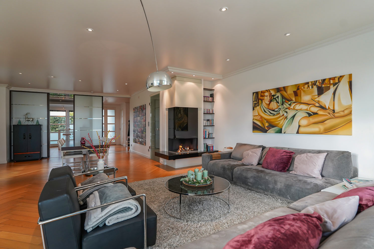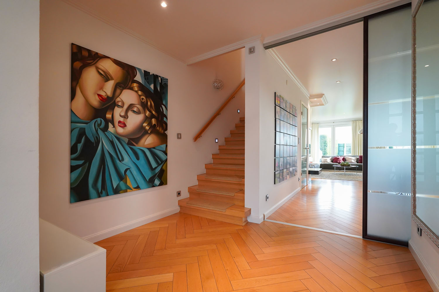 Beim Betreten gelangen Sie in den Eingangsbereich, der durch eine Glasschiebetür sowohl von der Küche als auch vom Wohnbereich abgetrennt werden kann. Rechts befindet sich die hochwertige Poggenpohl-Küche, die nahtlos an das angrenzende Wohnzimmer mit Essbereich anschließt.