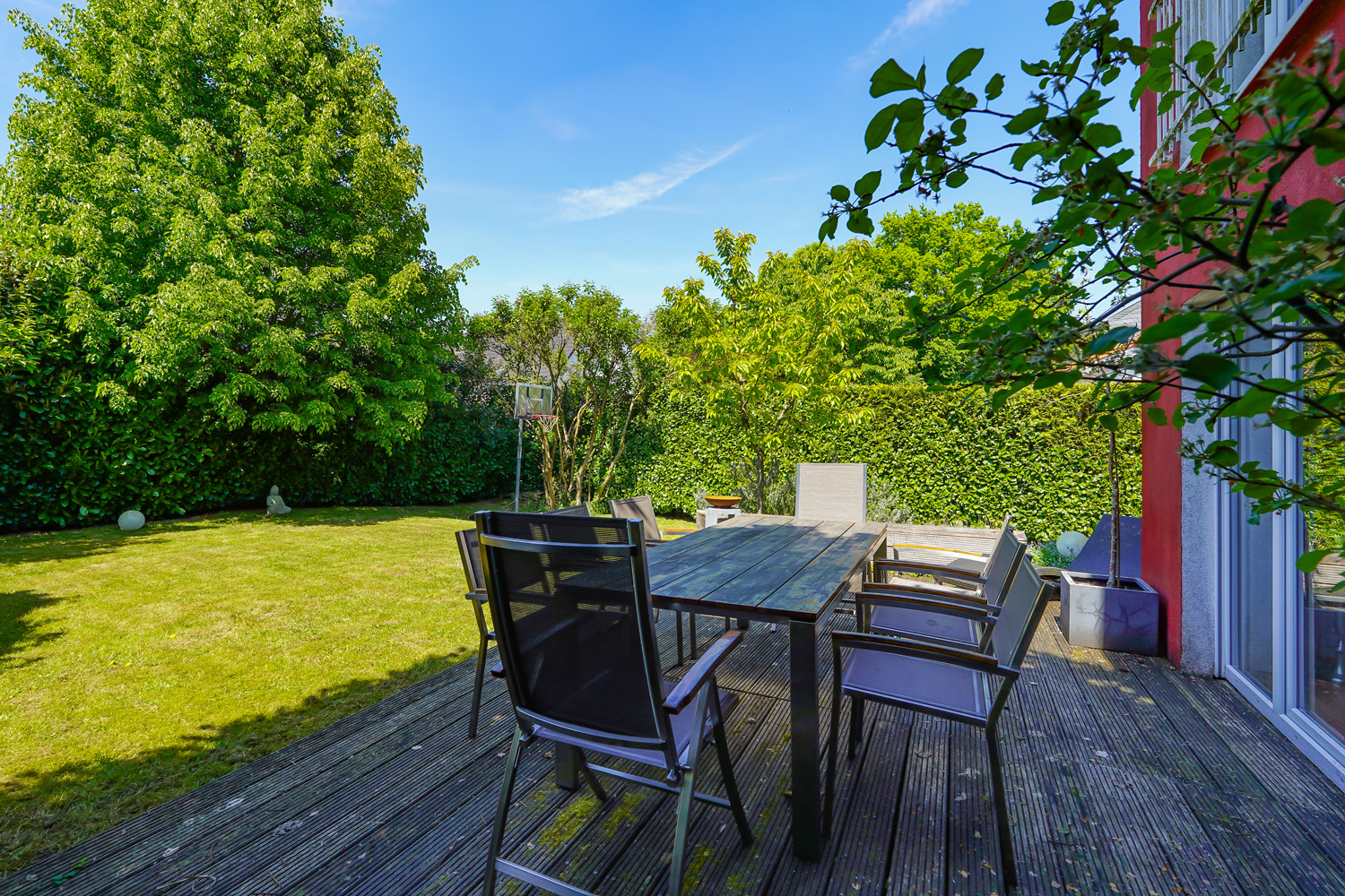 Die sonnige Terrasse sowie der grüne Garten erweitern den Wohnraum ins Freie – ein perfekter Ort für erholsame Stunden.