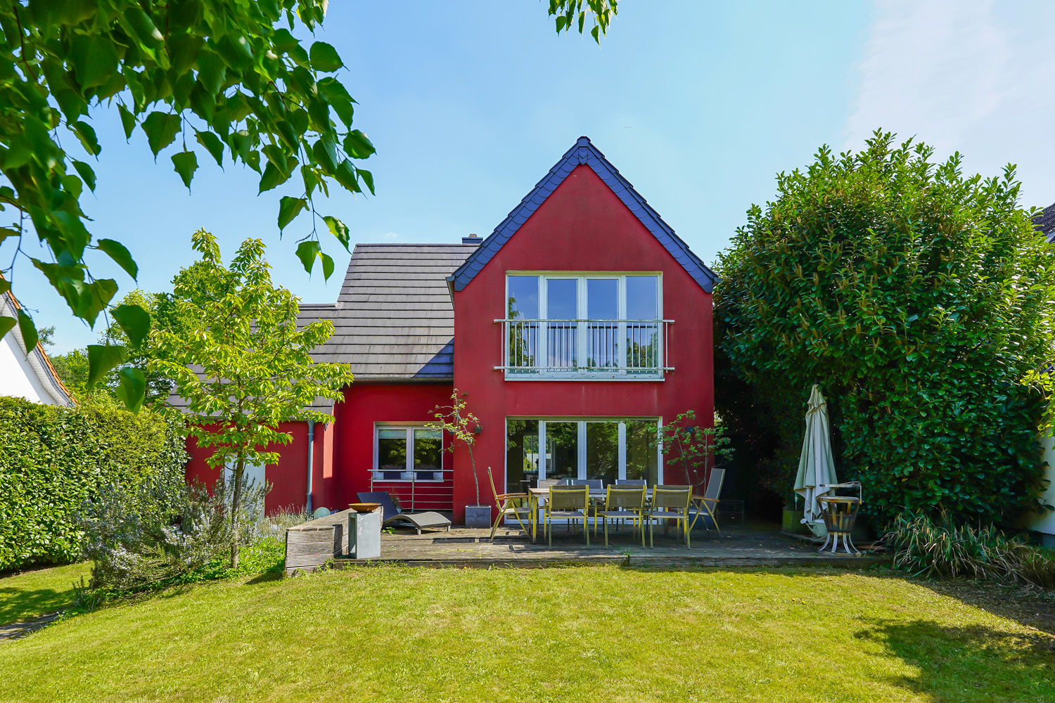 Dieses charmante, liebevoll gepflegte Einfamilienhaus besticht durch seinen einladenden roten Außenanstrich und einen traumhaften Garten, der zum Entspannen, Spielen oder Gärtnern einlädt.