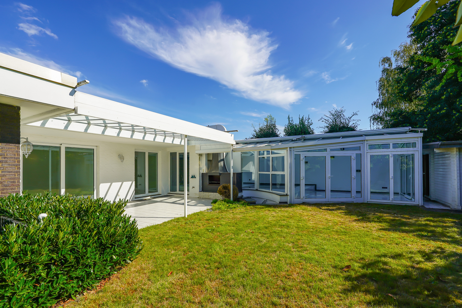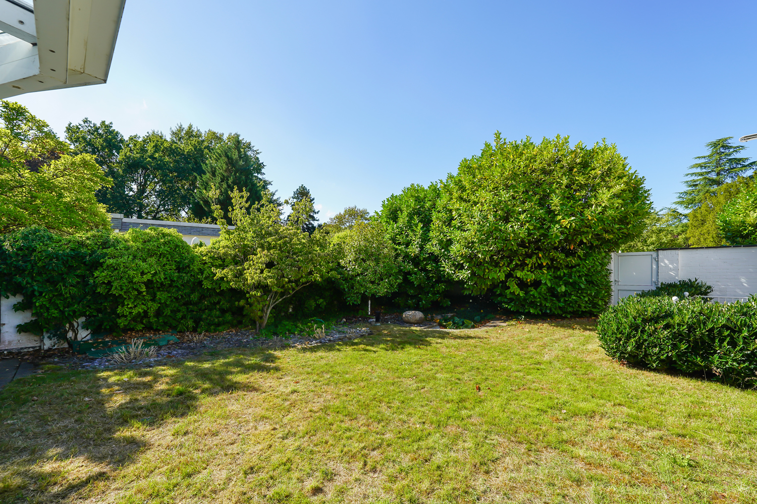 Urlaub in den eigenen vier Wänden erhält bei diesem Haus eine ganz neue Bedeutung. Der Garten ist pflegeleicht angelegt, mit einem kleinen Teich, Außendusche, Terrassen und hoher Randbepflanzung, die keine neugierigen Blicke zulässt. Hinter dem Schlafzimmer befindet sich das Schwimmbad mit angeschlossenem Wintergarten und Blick in den Garten. Im Sommer öffnen Sie diesen und können sich direkt vom Sonnenbad auf der Südwestterrasse in Ihrem eigenen Swimmingpool abkühlen. In einem Holzgartenhaus befinden sich außerdem eine finnische Sauna sowie eine Dampfsauna.