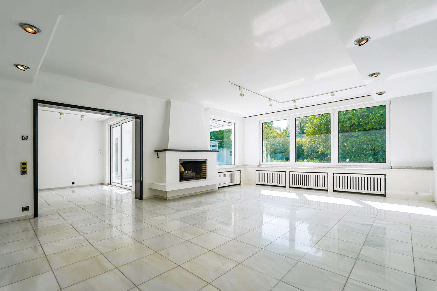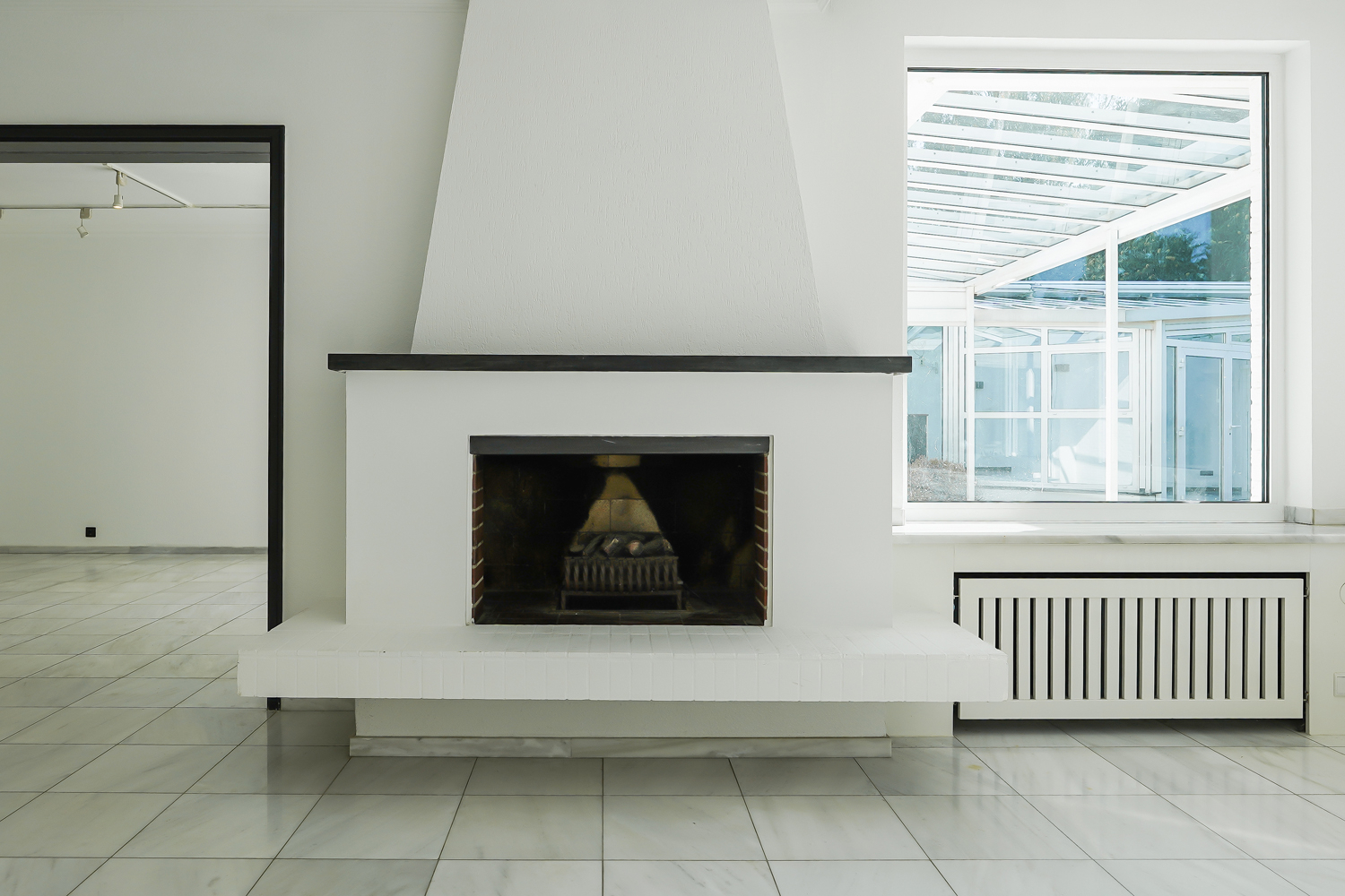 Transparenz von der ersten Sekunde an – eintreten in das Haus und bis in den Garten sehen: Die gesamte Flucht wurde mit Glastüren mit schwarz lackierten Klavierlack-Rahmen zur Unterteilung der einzelnen Räume gestaltet. Der Wohn-/Essbereich ist offen gestaltet, mit einem offenen Kamin und großen Glasfronten.