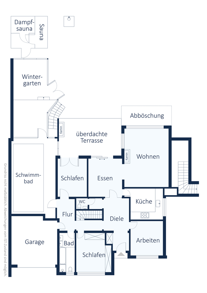 - ca. 165 m² reine Wohnfläche im Erdgeschoss (ohne Wintergarten und Pool)