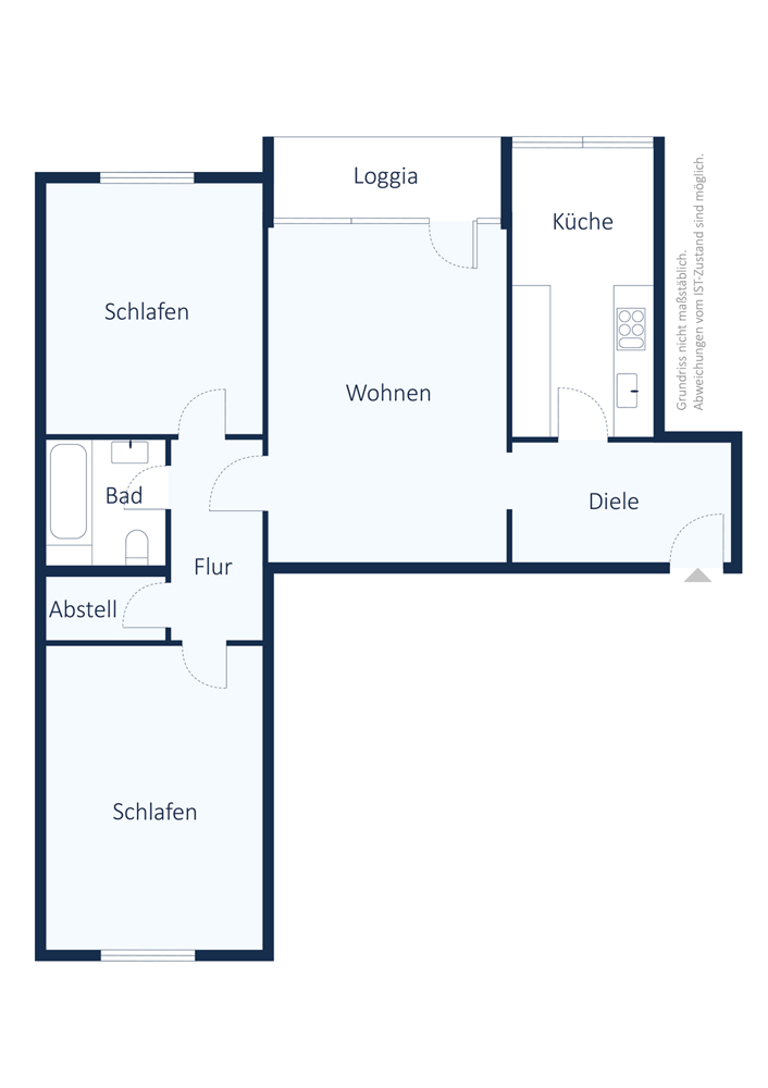 Der durchdachte Grundriss umfasst zwei gemütliche Schlafzimmer sowie ein einladendes Wohnzimmer mit Zugang zur sonnigen West-Loggia. Bereits der Eingangsbereich überzeugt mit großzügigem Platz für Garderobe und Schuhschrank und sorgt für einen angenehm aufgeräumten ersten Eindruck.