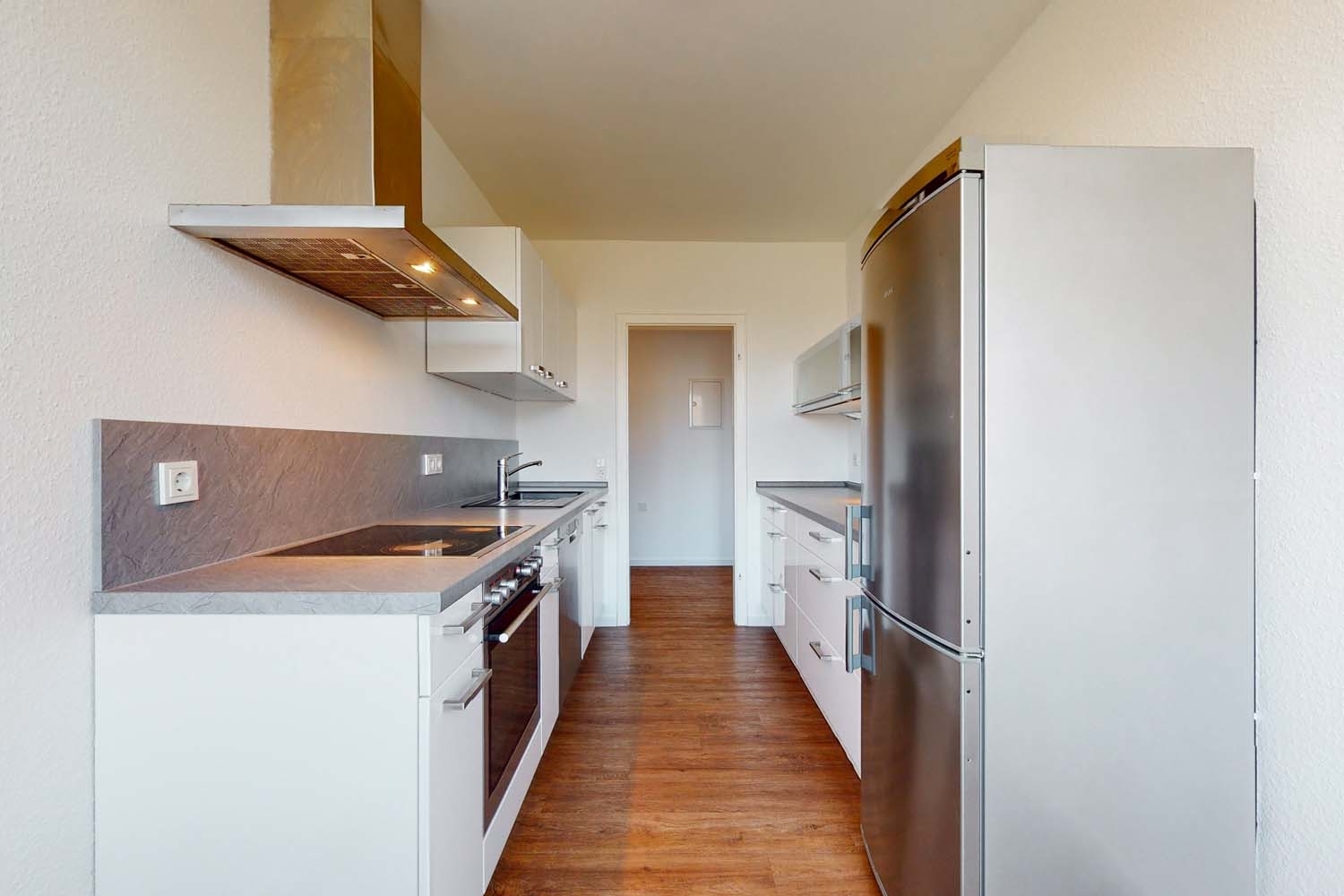 Die Küche ist separat gelegen und bietet ausreichend Fläche für einen kleinen Esstisch – perfekt für einen schnellen Kaffee am Morgen oder das spontane Abendessen. Die zeitlose Einbauküche ist bereits vollständig integriert, sodass Sie direkt einziehen und sich wohlfühlen können.