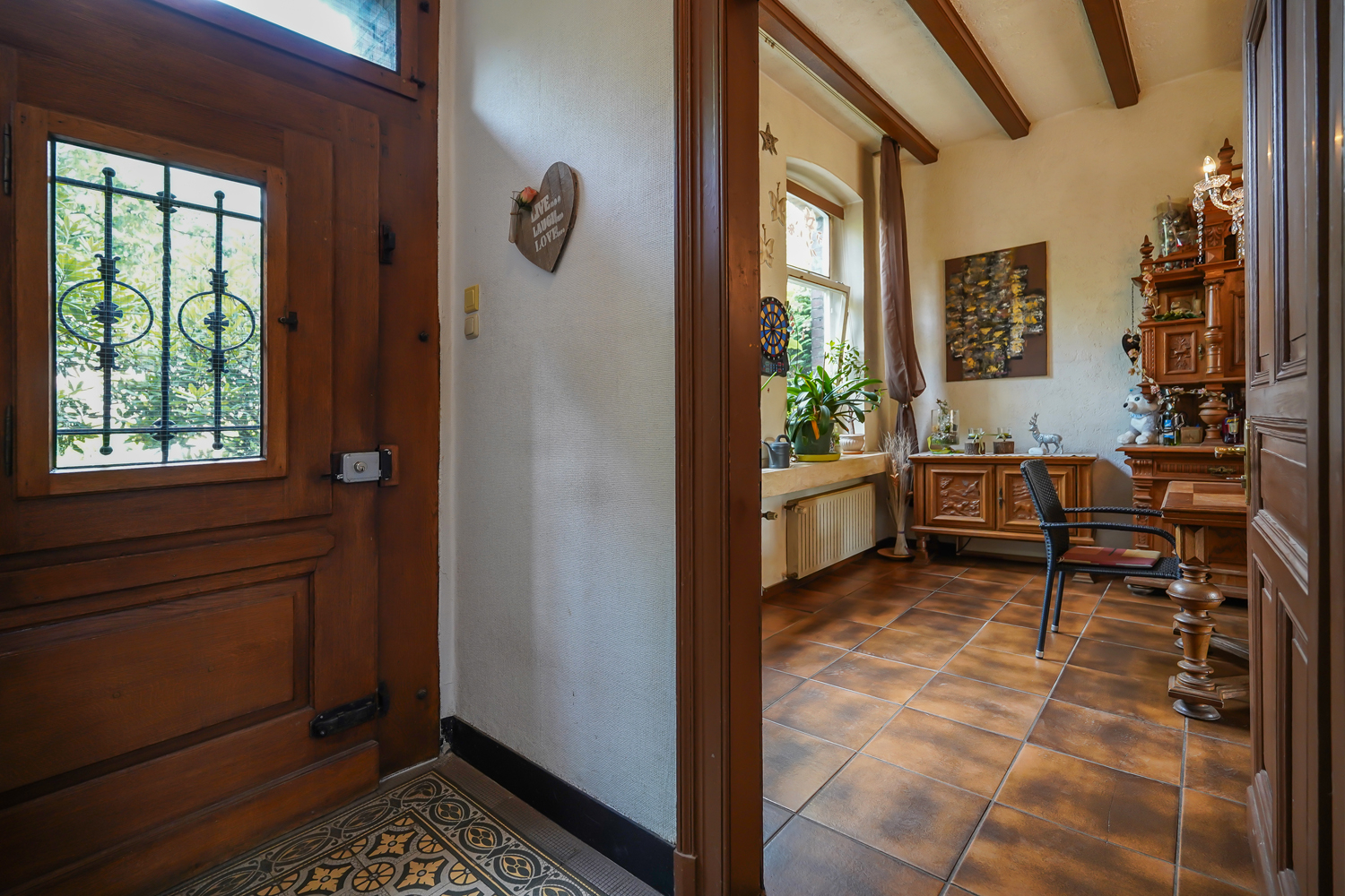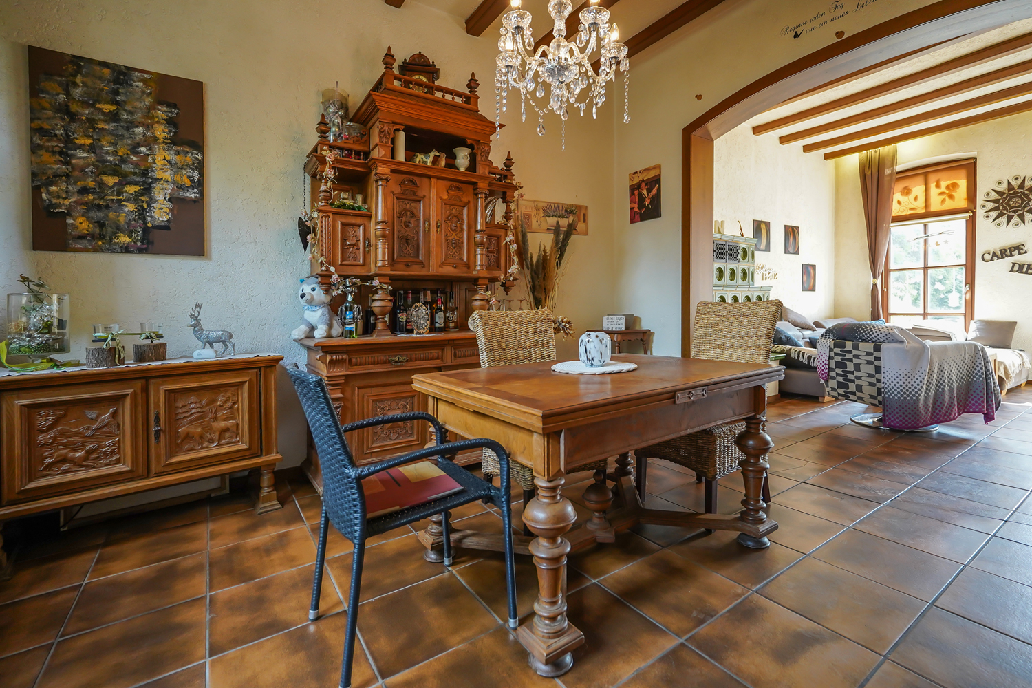 Bereits beim Eintreten empfängt Sie eine massive Eingangstür mit schmiedeeisernen Details, die den besonderen Charakter des Hauses erahnen lässt. Im Inneren erwarten Sie hohe Decken, eine elegante Holztreppe mit kunstvollem Handlauf sowie liebevoll erhaltene Originaldetails wie hübsche alte Fliesen, Dielenböden und ein nostalgischer Kachelofen, der Behaglichkeit ausstrahlt.