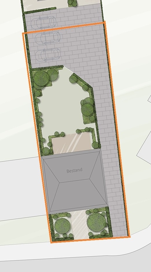 Aktuell befinden sich im hinteren Teil noch ein Anbau und Garagen, die es zu entfernen gilt. Rechts am Haus verläuft ein gemeinsamer Privatweg zu den zum Haus gehörenden drei eigenen Stellplätzen sowie zum Bauland in der zweiten Reihe.
