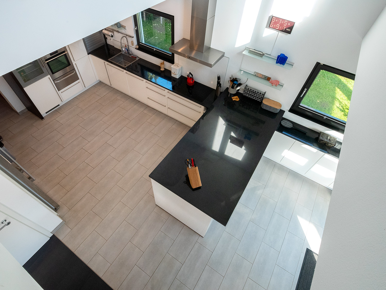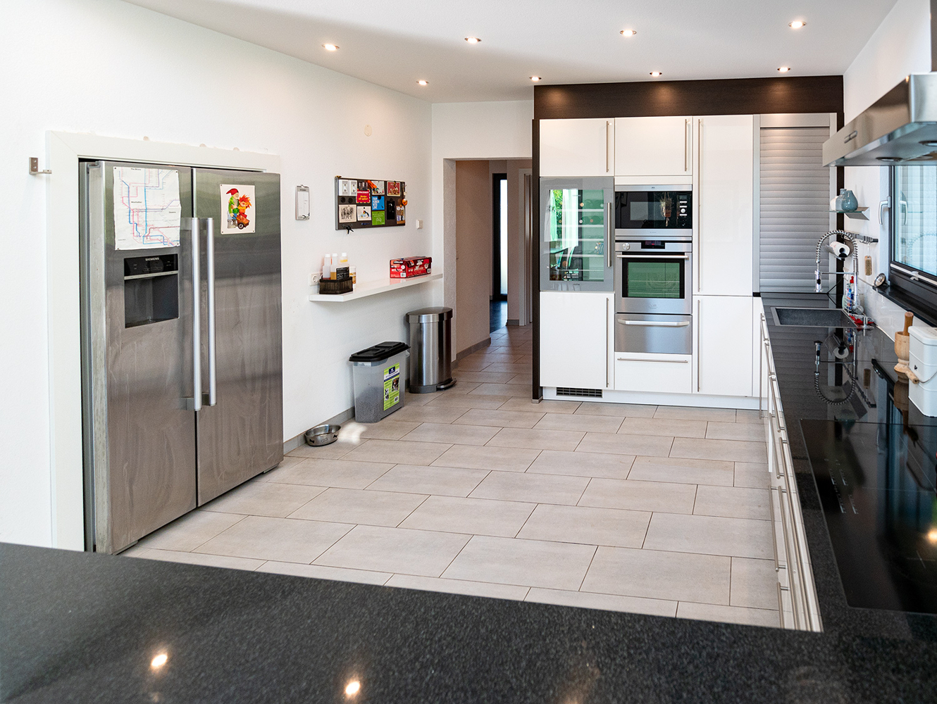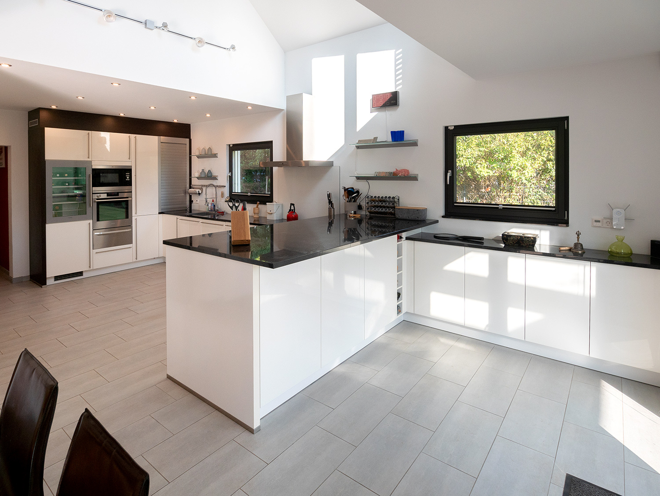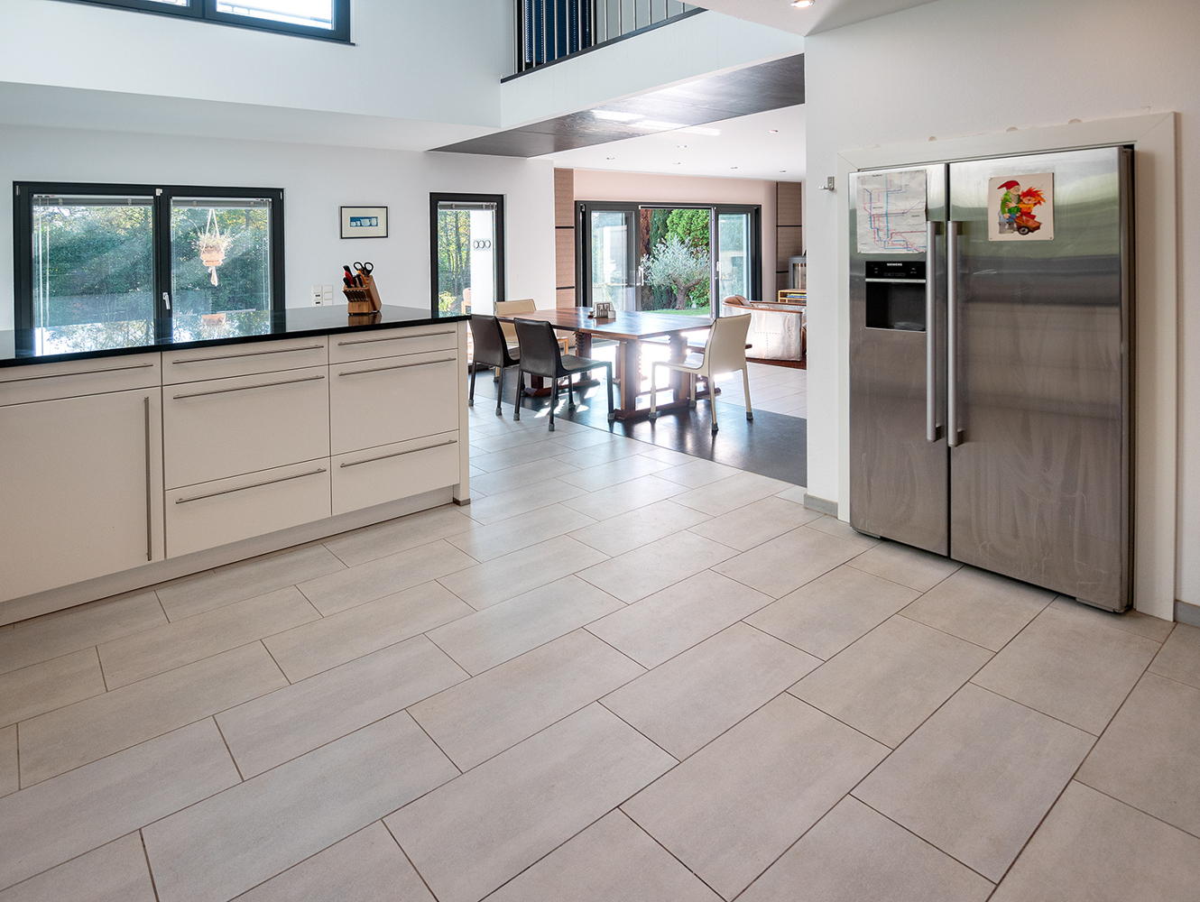 Eine raumbildende Treppenanlage führt nach oben ins Obergeschoss. Sie teilt geschickt den offen gehaltenen Küchenbereich vom Wohn- und Essbereich ab. Unter der Treppe versteckt sich ein praktischer Abstellraum. Das Interieur ist durchgehend in weiß-grau gehalten, ob Fliesen, Fenster oder Bodenbeläge. Die hochwertige NOLTE Küche nimmt die Farbgestaltung mit den weißen Fronten und der Granitplatte wieder auf. Siemensgeräte mit Edelstahlfronten, der große amerikanische Kühlschrank, ein Weinkühlschrank und ein Küchentresen mit Barhockern begeistern den Hobbykoch. Über der Küche liegt die offene Galerie. Blickbeziehungen nach oben und nach draußen lassen die Räume grenzenlos wirken.