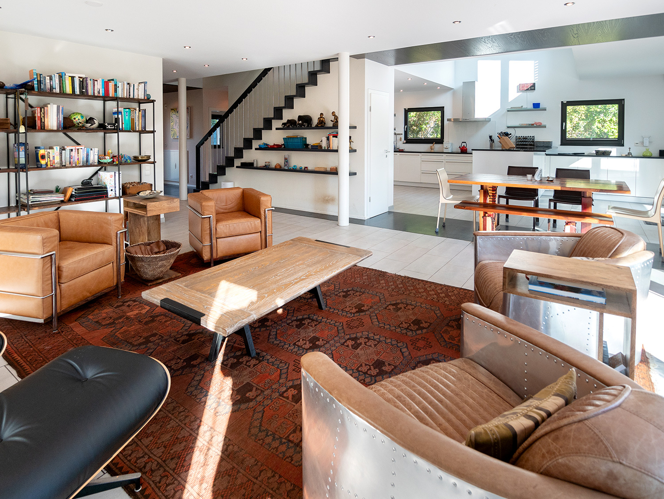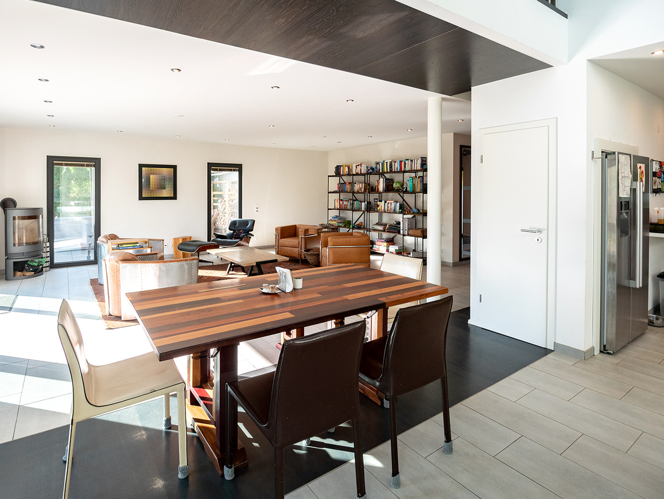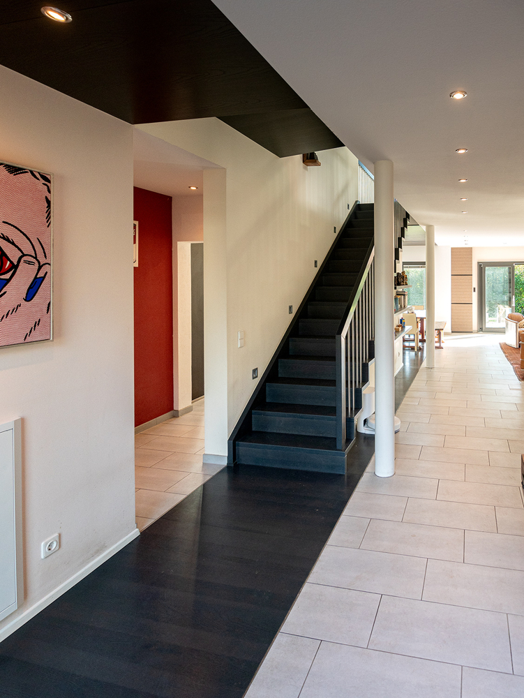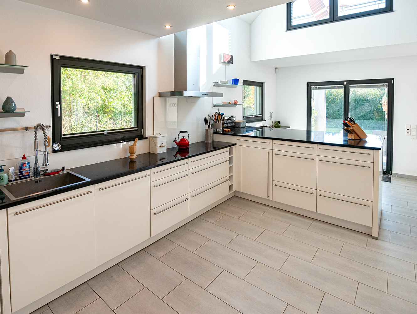Eine raumbildende Treppenanlage führt nach oben ins Obergeschoss. Sie teilt geschickt den offen gehaltenen Küchenbereich vom Wohn- und Essbereich ab. Unter der Treppe versteckt sich ein praktischer Abstellraum. Das Interieur ist durchgehend in weiß-grau gehalten, ob Fliesen, Fenster oder Bodenbeläge. Die hochwertige NOLTE Küche nimmt die Farbgestaltung mit den weißen Fronten und der Granitplatte wieder auf. Siemensgeräte mit Edelstahlfronten, der große amerikanische Kühlschrank, ein Weinkühlschrank und ein Küchentresen mit Barhockern begeistern den Hobbykoch. Über der Küche liegt die offene Galerie. Blickbeziehungen nach oben und nach draußen lassen die Räume grenzenlos wirken.