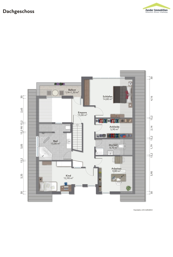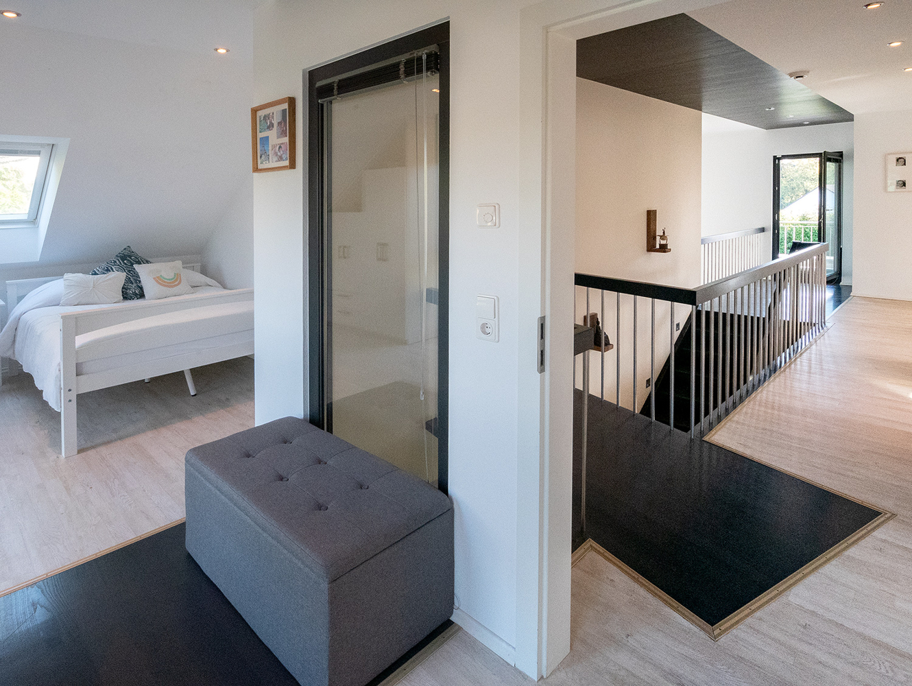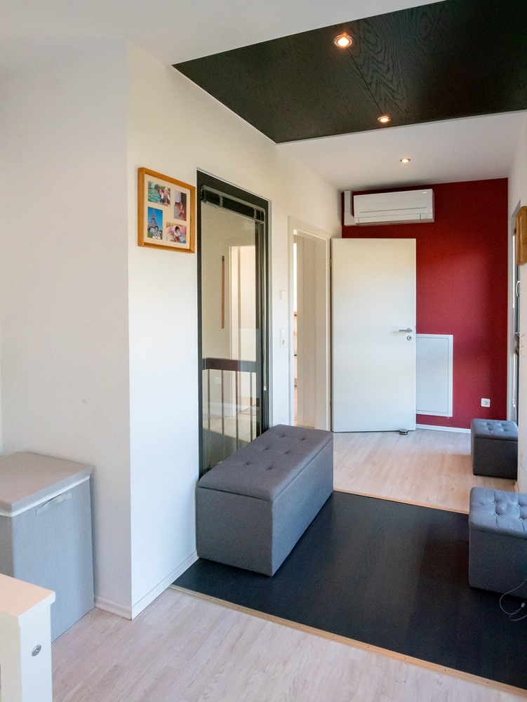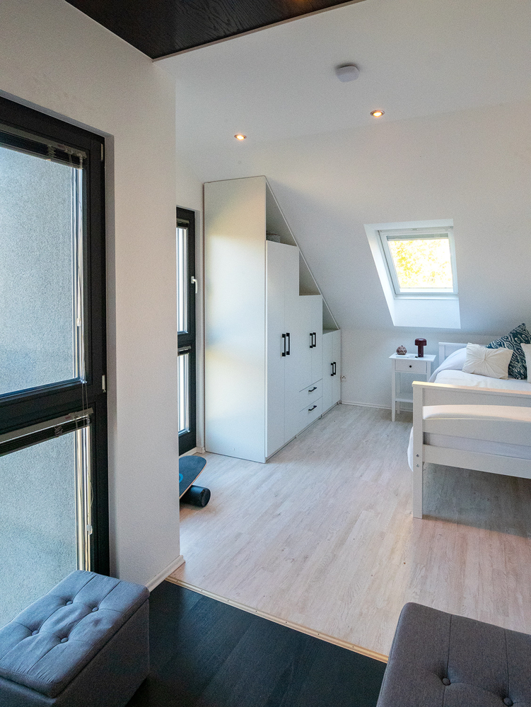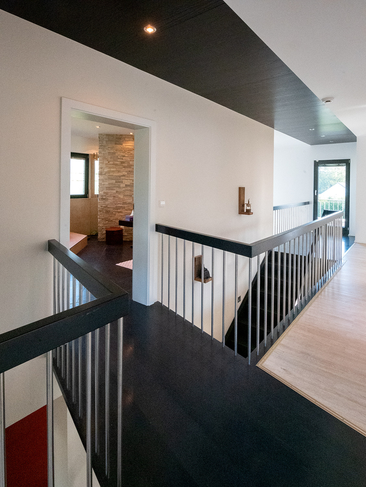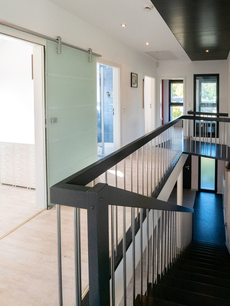 Im Obergeschoss befinden sich die privaten Rückzugsräume. 4 Räume und zwei Badezimmer warten auf Ihre persönlichen Bedarfe. Ob Masterschlafzimmer mit Ankleide, Büro für Ihr Homeoffice oder Kinderzimmer, es bieten sich viele Optionen. Vielleicht wird ein Lesesessel auf der offenen Galerie zu Ihrem Lieblingsplatz? Oder auch der Balkon, den Sie von der Galerie aus betreten. Ein besonderes Gestaltungselement ist die Brücke zum Masterbad über dem Treppenaufgang. Das Masterschlafzimmer verfügt, wie alle weiteren Schlafräume, über ein Klimagerät. Im Spitzboden gibt es benötigte Abstellfläche.