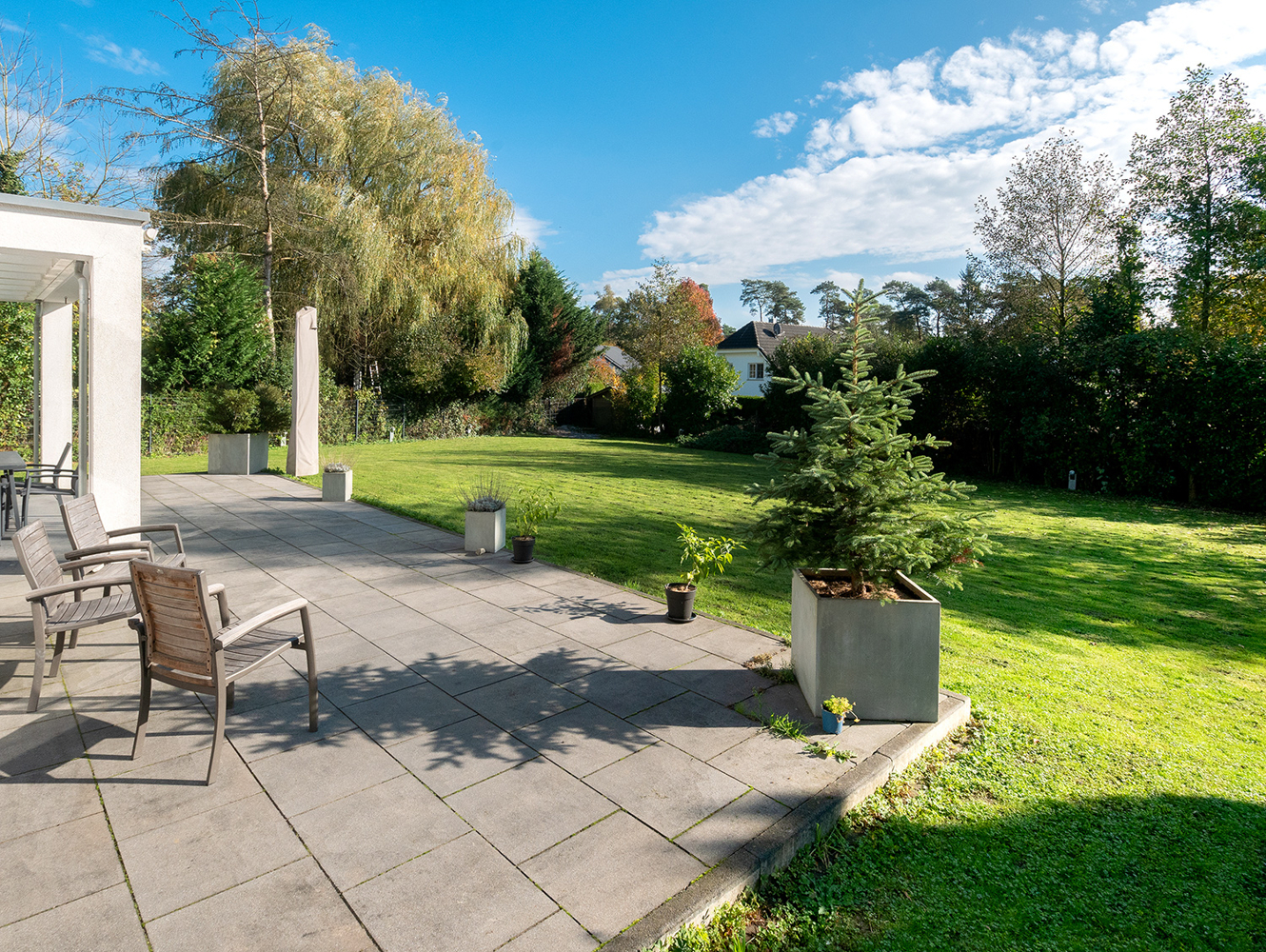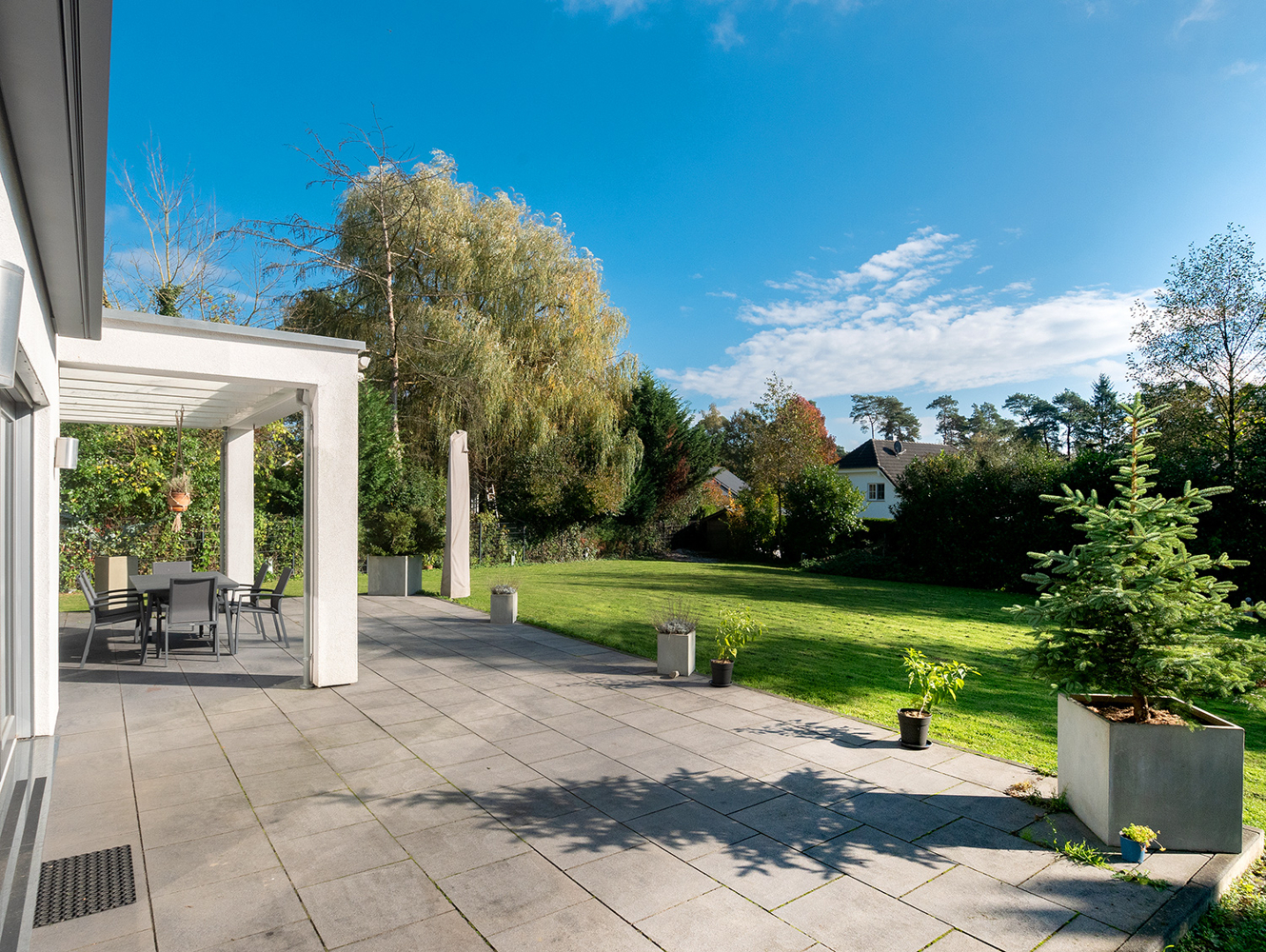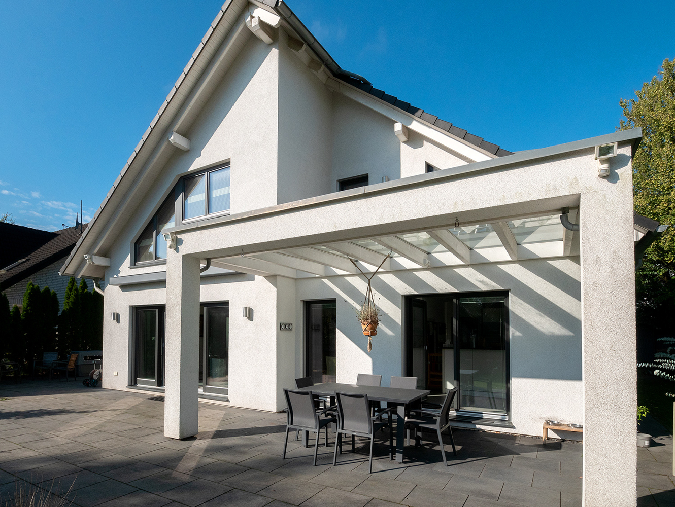 Im Winter warten gemütliche Stunden vor dem Kaminofen auf Sie. Im Sommer betreten Sie vom Wohnbereich aus die Terrassenanlage, die über die komplette Hausbreite reicht. Ein Teil ist mit einer spektakulären Überdachung versehen. Glaselemente lassen Licht hindurch und schützen vor Regen. So verfügen Sie über einen wetterunabhängigen Sitzplatz. Der Garten ist pflegeleicht angelegt und zeichnet sich durch ausladende Rasenflächen aus.