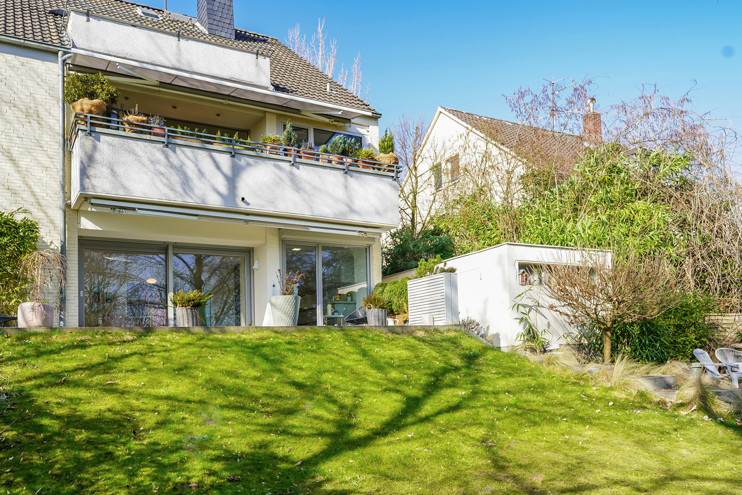 Entspannen Sie auf der ca. 35 m² großen, erhöhten Terrasse mit elektrische Markise, die einen fantastischen Blick über den weitläufigen Garten von ca. 560 m² bietet. Dieser steht Ihnen zur alleinigen Nutzung zur Verfügung und umfasst eine zusätzliche Holzterrasse, ein Gartenhaus und ein Kinder-Spielhaus.